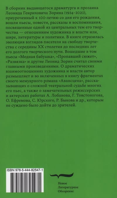 В сборник выдающегося драматурга и прозаика Леонида Генриховича Зорина (1924–2020), приуроченный к 100-летию со дня его рождения, вошли пьесы, повести, рассказы и воспоминания, посвященные одной из центральных тем его творчества — отношениям художника и власти или, шире, литературы и политики. В книге отразилась эволюция взглядов писателя на свободу творчества с середины ХХ столетия до последних лет его долгого творческого пути. Вошедшие в том пьесы «Медная бабушка», «Пропавший сюжет», «Развязка» и другие Леонид Зорин считал своими главными произведениями. О драматических взаимоотношениях художника и власти автор размышляет и во включенных в книгу фрагментах своего мемуарного романа «Авансцена», рассказывающих о сложной театральной судьбе многих его пьес, а также о замечательных режиссерских и актерских работах А. Лобанова, Г. Товстоногова, О. Ефремова, С. Юрского, Р. Быкова и др., которым не суждено было дойти до зрителей.