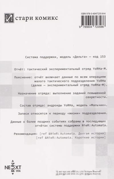 «Мальчишки YoRHa» — официальный роман-приквел к событиям культовой видеоигры NieR: Automata. Эйсима Дзюн в тесном сотрудничестве с Ёко Таро (режиссёром и сценаристом NieR: Automata) представляют вашему вниманию литературное переложение радиопостановки .«Проект YoRHa», включающее историю создания и становления отряда YoRHa-М — начало «проклятия» и «кары» андроидов на пути превращения в солдат-марионеток.