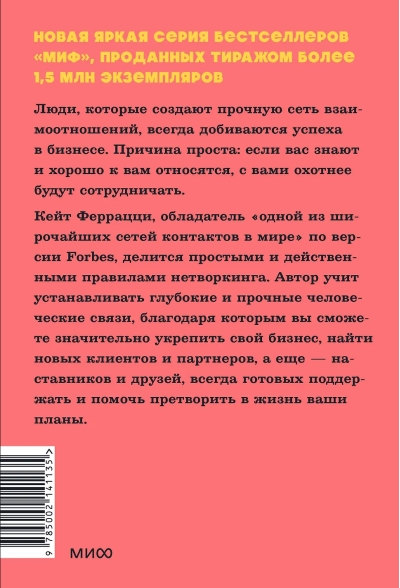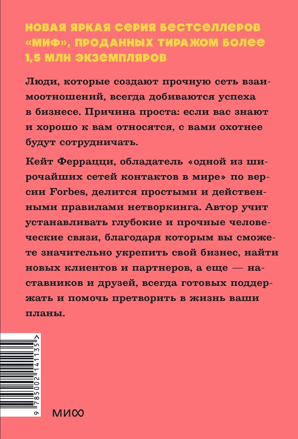 Кейт Феррацци, обладатель «одной из широчайших сетей контактов в мире» по версии Forbes, делится простыми и действенными правилами нетворкинга. Он раскрывает секреты построения широкой сети взаимовыгодных связей в бизнесе и не только. И учит устанавливать глубокие и прочные человеческие связи, благодаря которым вы сможете значительно укрепить свой бизнес, найти новых клиентов и партнеров, а еще — наставников и друзей, всегда готовых поддержать и помочь претворить в жизнь ваши планы.
