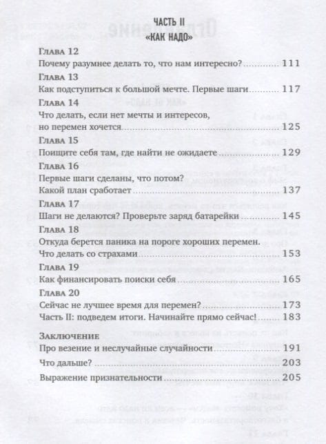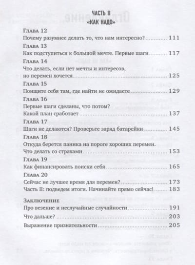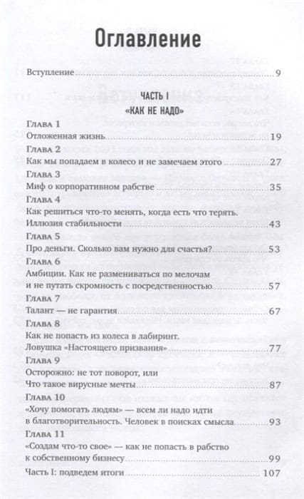 Задача этой книги - помочь вам не только начать путь, но и не заблудиться по дороге. Потому что тропинки, ведущие в тупик или к обрыву, выглядят вполне протоптанными - и их очень легко спутать с правильными. Первая часть книги о том, "как не надо": почему мы годами застреваем в режиме "отложенная жизнь" и как самые ответственные и "правильные" из нас загоняют себя в ловушку, из которой рискуют не выбраться никогда. Во второй части вы узнаете, как отключается автопилот и мы берем управление на себя. Я избавлю вас от мифа о корпоративном рабстве, а также от иллюзии того, что если ничего не делать, стабильность вам обеспечена. В третьей части вы поймете, что же такое ваши амбиции и какой мощной силой вы обладаете, а еще узнаете, что выдающийся талант и высокий интеллект не так много значат для успеха, как вы думали. В четвертой части мы поговорим о неверных поворотах и шаблонных подходах, которые могут обойтись вам дорого. Я расскажу о ловушке настоящего призвания, о вирусных мечтах, о том, откуда берется всеобщее желание идти в благотворительность, и о том, почему люди могут быть несчастны в своем собственном бизнесе. В пятой части мы перейдем непосредственно к плану действий. Если у вас есть большая мечта, вы поймете, как к ней наконец подступиться. Если мечты и интересов нет, вы начнете действовать так, чтобы они у вас появились. В заключительной, шестой части мы разберемся с любимыми отговорками и блоками, которые мы все мастера городить на своем пути. Речь пойдет про денежные страхи, про боязнь что-то менять в кризис, про другие опасения и о том, как не дать им остановить вас. В книге есть практические блоки - это техники, которые здорово работают и не раз проверены. Также в конце каждой главы вас ждет выжимка из главных мыслей и как минимум один стереотип, который мы перезагрузили. Книга покажет вам, как на самом деле происходит переход от состояния "я не на своем месте" в состояние счастливого профессионала. Вы поймете, что на практике всё проще и интереснее, чем вы думали.