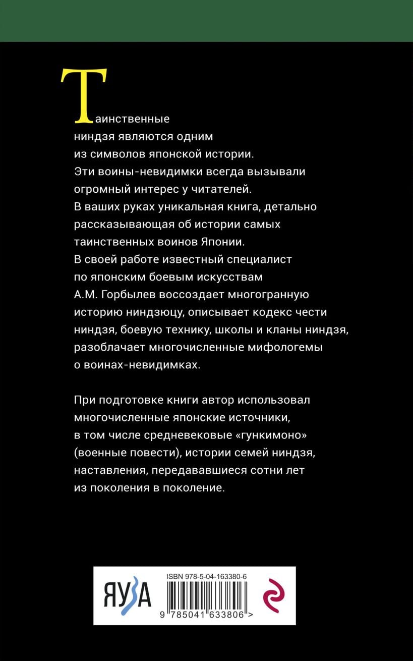 Таинственные ниндзя являются одним из символов японской истории. Эти воины-невидимки всегда вызывали огромный интерес у читателей. В ваших руках уникальная книга, детально рассказывающая об истории самых таинственных воинов Японии. В своей работе известный специалист по японским боевым искусствам А.М. Горбылёв воссоздает многогранную историю ниндзицу, описывает кодекс чести ниндзя, боевую технику, школы и кланы ниндзя, разоблачает многочисленные мифологемы о воинах-невидимках.
