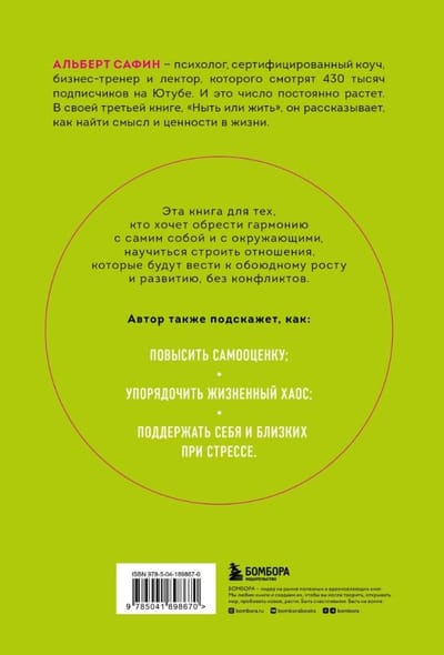 Альберт Сафин — психолог, сертифицированный коуч, бизнес-тренер и лектор, которого смотрят 420 тысяч подписчиков на Ютубе. И это число постоянно растет. В своей третьей книге, «Ныть или жить», он рассказывает, как найти смысл и ценности в жизни.