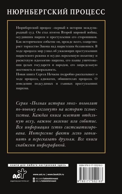 Сегодня, когда прошло уже почти 80 лет со дня начала Нюрнбергского процесса, отчетливо видно, какую колоссальную роль он сыграл в историческом, юридическом и общественно-политическом планах. Нюрнбергский процесс – это был первый в истории международный суд. Он стал итогом Второй мировой войны, осудившим нацизм и преступления его сторонников. Он стал историческим событием, прежде всего, как торжество Закона перед нацистским беззаконием. Он осудил вероломную политику и расистскую идеологию нацизма, его планы уничтожения целых государств и народов, его запредельную жестокость и аморальность. Новая книга Сергея Нечаева подробно рассказывает о ходе процесса, адвокатах, обвинителях процесса. О поведении подсудимых и главных преступлениях нацизма.