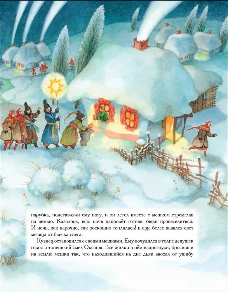 «Ночь перед Рождеством», пожалуй, самая сказочная и самая чарующая повесть Н. В. Гоголя из сборника «Вечера на хуторе близ Диканьки».  Пронизанные духом Рождества, иллюстрации художницы Ольги Ионайтис создают неповторимый колорит волшебной сказки. Несомненно, и взрослые, и дети получат большое удовольствие, перечитав невероятную историю о том, как черт украл месяц, и о том, как кузнец Вакула летал к царице в Петербург за черевичками для своей возлюбленной Оксаны.