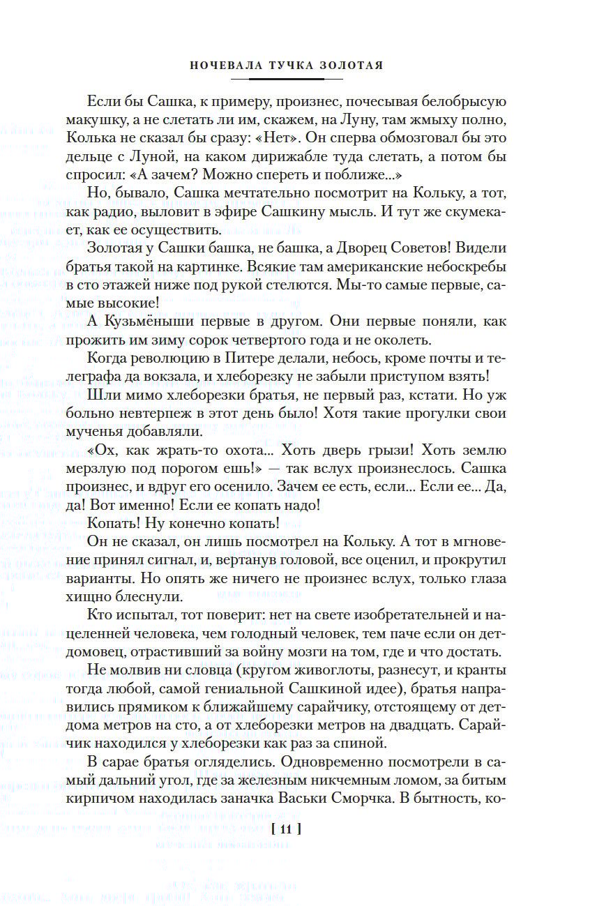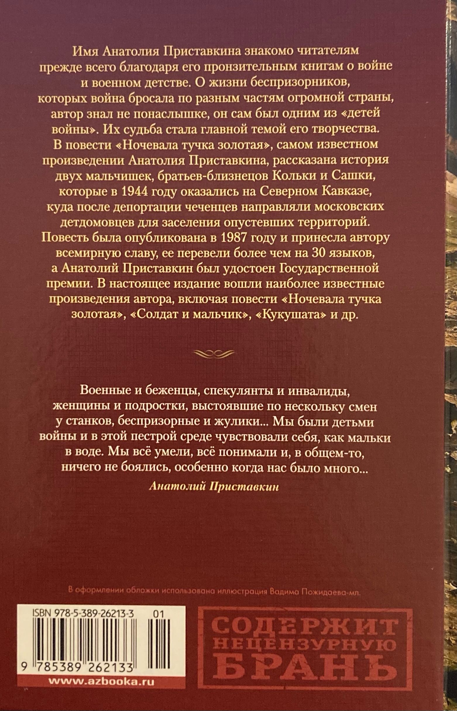 Имя Анатолия Приставкина знакомо читателям прежде всего благодаря его пронзительным книгам о войне и военном детстве. О жизни беспризорников, которых война бросала по разным частям огромной страны, автор знал не понаслышке, он сам был одним из «детей войны». Их судьба стала главной темой его творчества. В повести «Ночевала тучка золотая», самом известном произведении Анатолия Приставкина, рассказана история двух мальчишек, братьев-близнецов Кольки и Сашки, которые в 1944 году оказались на Северном Кавказе, куда после депортации чеченцев направляли московских детдомовцев для заселения опустевших территорий. Повесть была опубликована в 1987 году и принесла автору всемирную славу. Ее перевели более чем на 30 языков, а Анатолий Приставкин был удостоен Государственной премии. В настоящее издание вошли наиболее известные произведения автора, включая повести «Ночевала тучка золотая», «Солдат и мальчик», «Кукушата» и др.