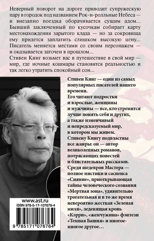 Бывший заключенный по кусочкам собирает карту местонахождения зарытого клада — но за сокровища ему придется заплатить слишком высокую цену… Писатель меняется местами со своим персонажем — и оказывается заточен в прошлом… Стивен Кинг возьмет вас в путешествие в свой мир, мир, где ночные кошмары становятся реальностью и так легко утратить спокойный сон…