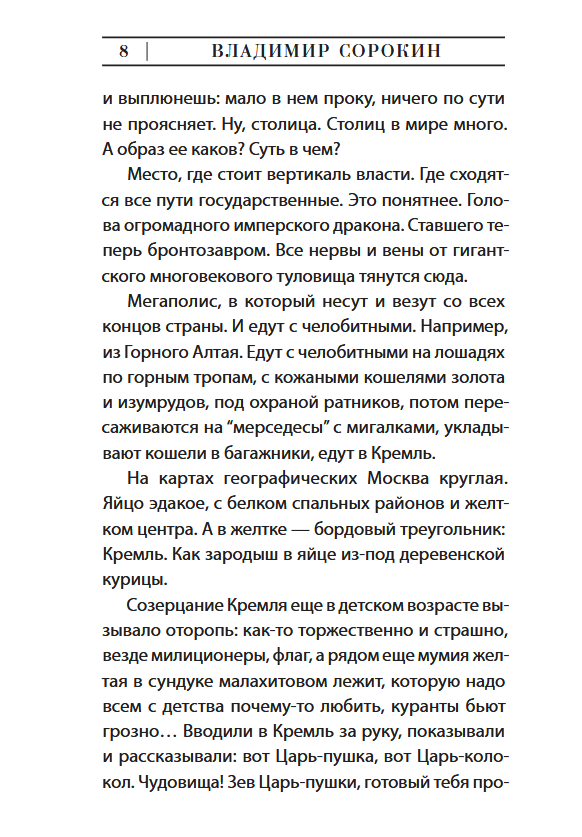 В нехудожественной прозе автор не изменяет любимым темам: еда и питье как проявления национального характера, Москва и Берлин, взаимопроникновение жизни и литературы. Из небольших заметок вырисовывается сотканный из деталей cтиля и быта точный портрет двухтысячных, неумолимо становящихся прошедшей эпохой. Особого внимания достойны тексты о художественной среде восьмидесятых, сформировавшей Сорокина как писателя.