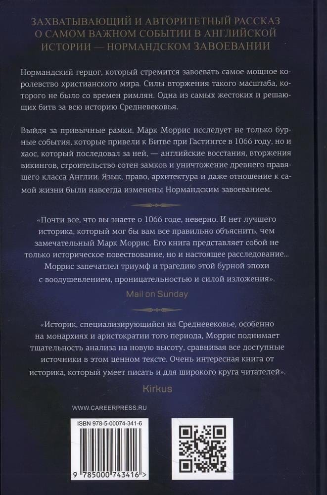 Книга Марка Морриса о ключевом событии английской истории — непросто очередной экскурс в прошлое. Это подведение итогов более чем векового изучения болезненной для англичан темы захвата острова чужеземцами. Моррис предлагает взглянуть на события с объективной точки зрения, подвергнув существенной критике как источники, так и теории о нормандском нашествии. Автор углубляется в контекст, а потому помимо истории Вильгельма Завоевателя читатель получает подробный исторический разбор эпохи, предшествовавшей призванию на трон Эдуарда Исповедника, саму историю Эдуарда, историю семьи Годвинсонов, очерк английской жизни перед вторжением, историю Нормандии до, во время и после Вильгельма. Отдельно рассказывается история создания Книги Судного дня. Завершается все тем, что последовало после кончины Вильгельма. Таким образом, читатель знакомится с историей Англии более чем за сто лет и получает живой рассказ о целой плеяде английских королей, эрлов и епископов. Марк Моррис — историк, телеведущий, специалист по английскому Средневековью. Автор целого ряда книг, ставших национальными бестселлерами.