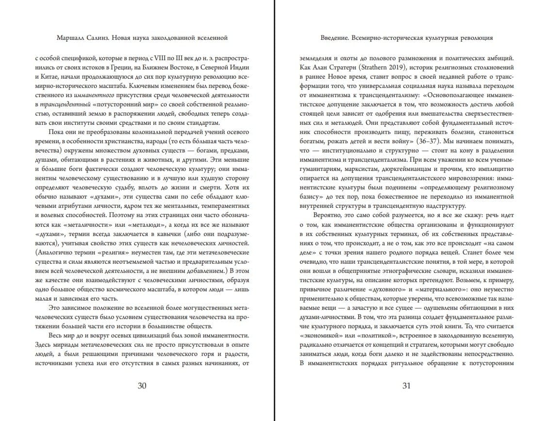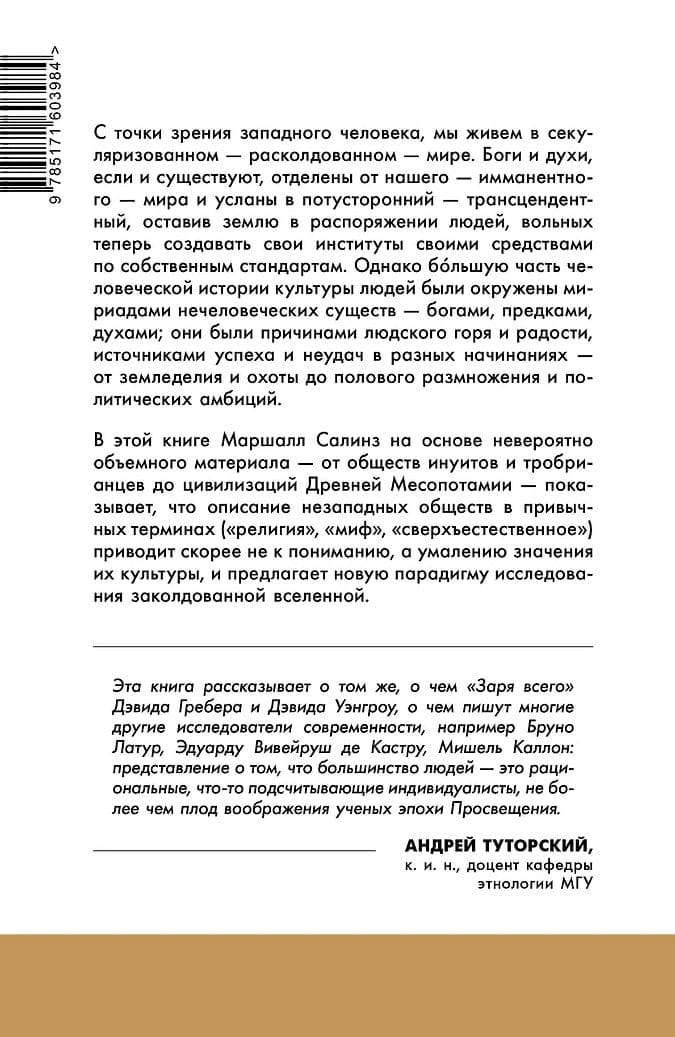 Маршалл Салинз на основе невероятно объемного материала - от обществ инуитов и тробрианцев до цивилизаций Древней Месопотамии - показывает, что описание незападных обществ в привычных терминах («религия», «миф», «сверхъестественное») приводит скорее не к пониманию, а умалению значения их культуры, и предлагает новую парадигму исследования заколдованной вселенной.