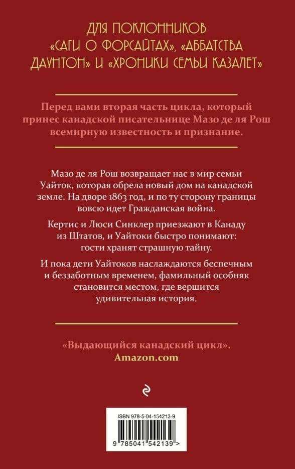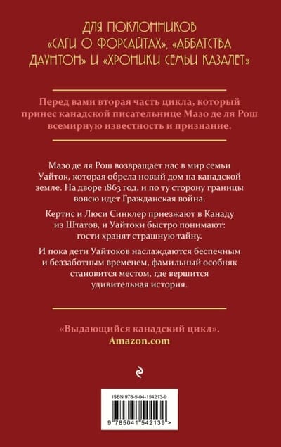 Мазо де ля Рош возвращает нас в мир семьи Уайток, которая обрела новый дом на канадской земле. На дворе 1863 год, и по ту сторону границы вовсю идет Гражданская война. Кертис и Люси Синклер приезжают в Канаду из Штатов, и Уайтоки быстро понимают: гости хранят страшную тайну. И пока дети Уайтоков наслаждаются беспечным и беззаботным временем, фамильный особняк становится местом, где вершится удивительная история.