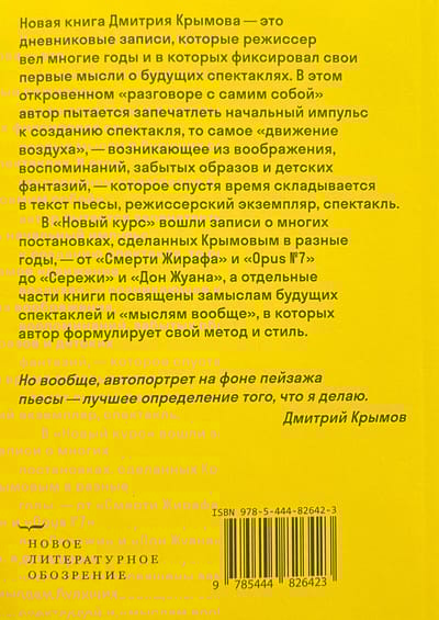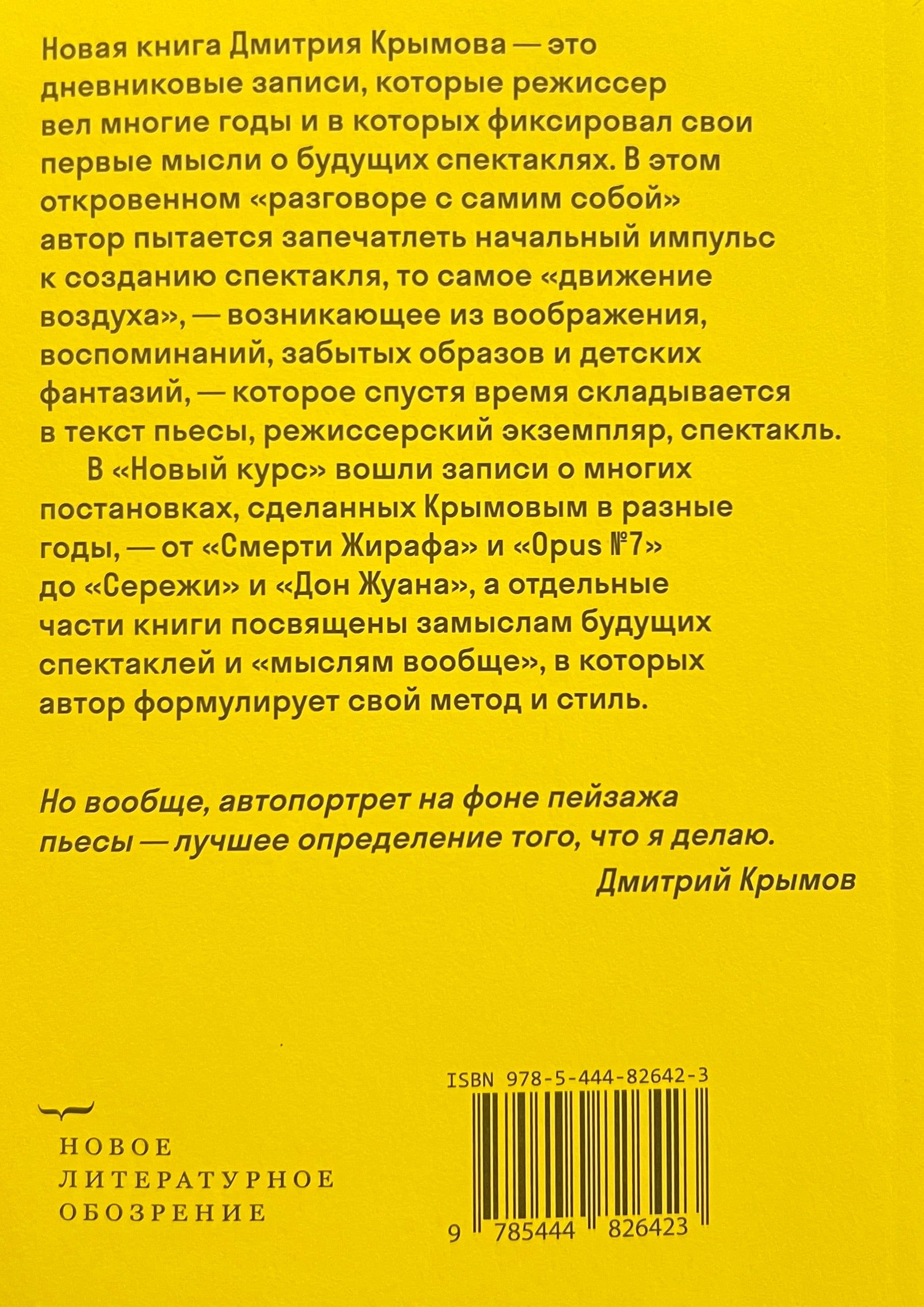Новая книга Дмитрия Крымова — это дневниковые записи, которые режиссер вел многие годы и в которых фиксировал свои первые мысли о будущих спектаклях. В этом откровенном «разговоре с самим собой» автор пытается запечатлеть начальный импульс к созданию спектакля, то самое «движение воздуха», — возникающее из воображения, воспоминаний, забытых образов и детских фантазий, — которое спустя время складывается в текст пьесы, режиссерский экземпляр, спектакль. В «Новый курс» вошли записи о многих постановках, сделанных Крымовым в разные годы, — от «Смерти Жирафа» и «Opus № 7» до «Сережи» и «Дон Жуана…», а отдельные части книги посвящены замыслам будущих спектаклей и «мыслям вообще», в которых автор формулирует свой метод и стиль.