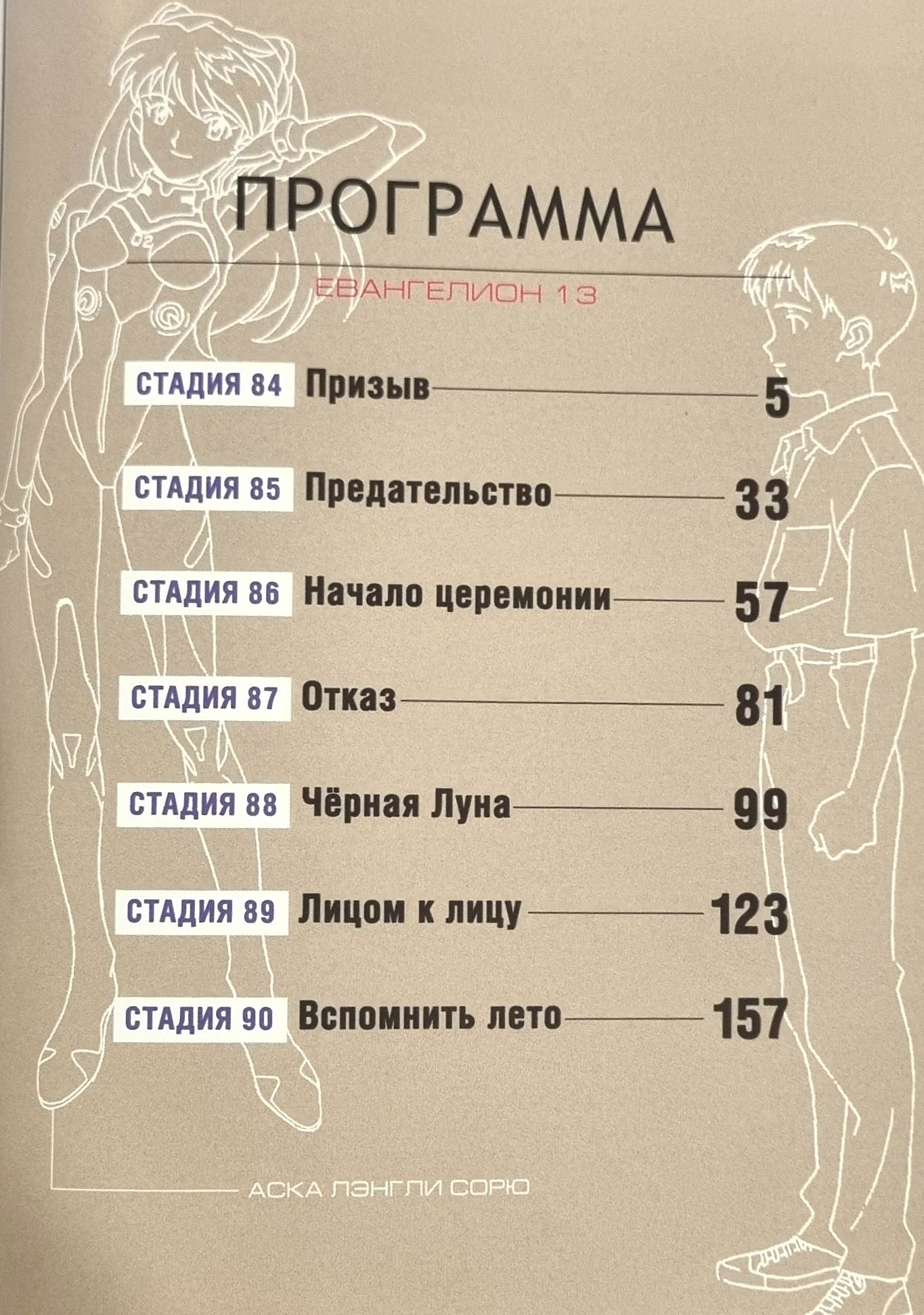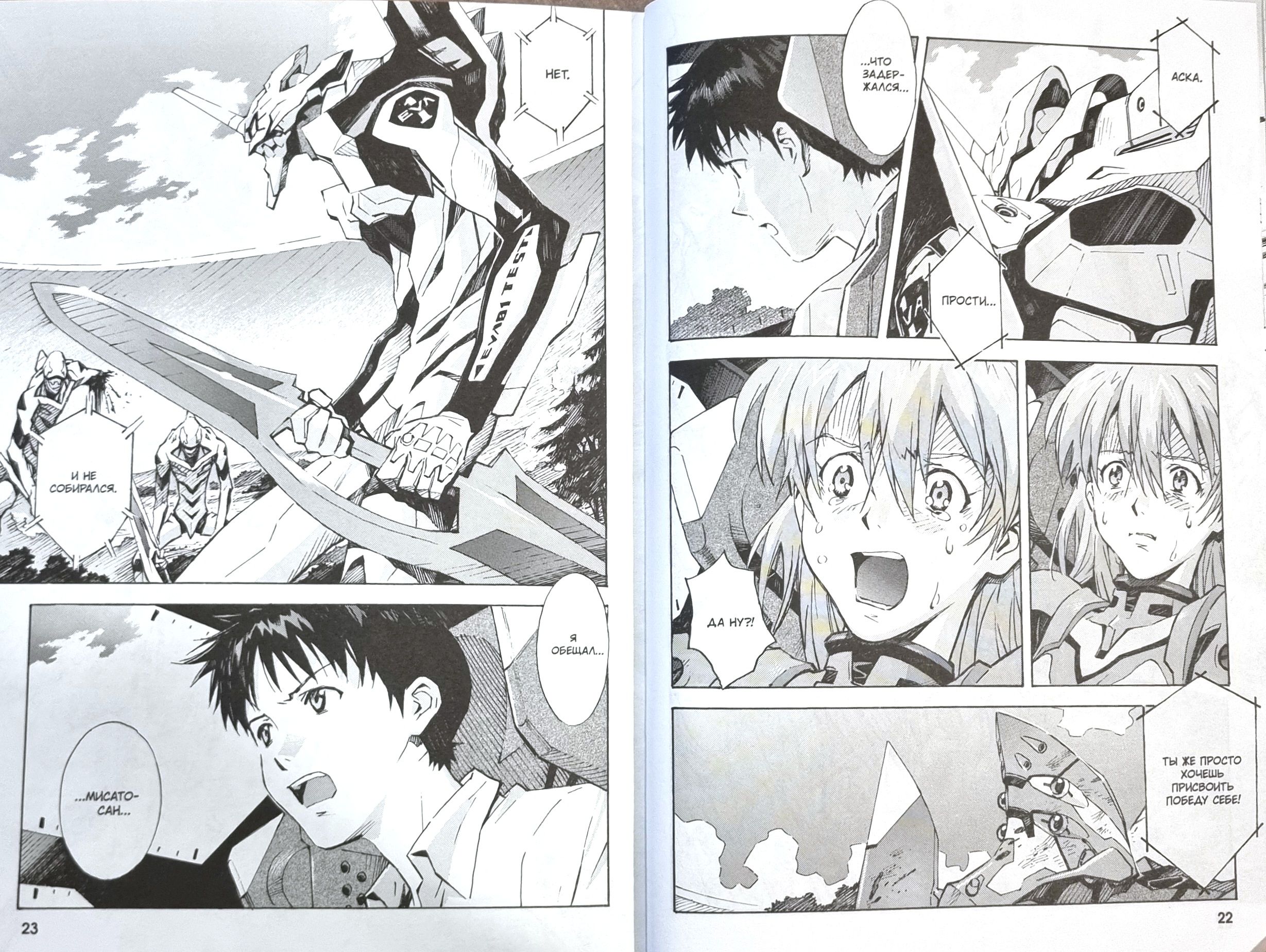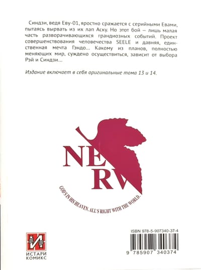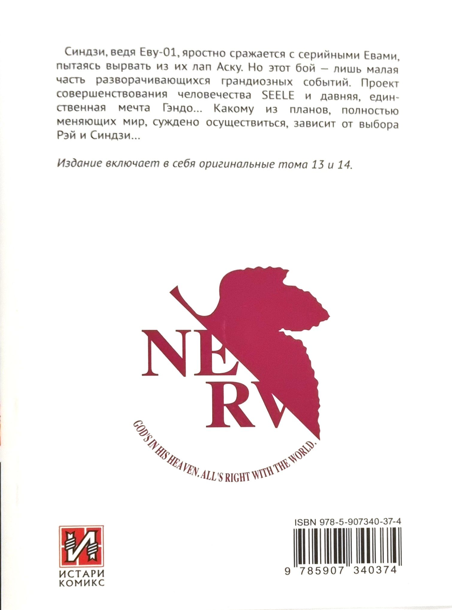 Синдзи, ведя Еву-01, яростно сражается с серийными Евами, пытаясь вырвать из их лап Аску. Но этот бой — лишь малая часть разворачивающихся грандиозных событий. Проект совершенствования человечества SEELE и давняя, единственная мечта Гэндо… Какому из планов, полностью меняющих мир, суждено осуществиться, зависит от выбора Рэй и Синдзи… Издание включает в себя оригинальные тома 13 и 14.