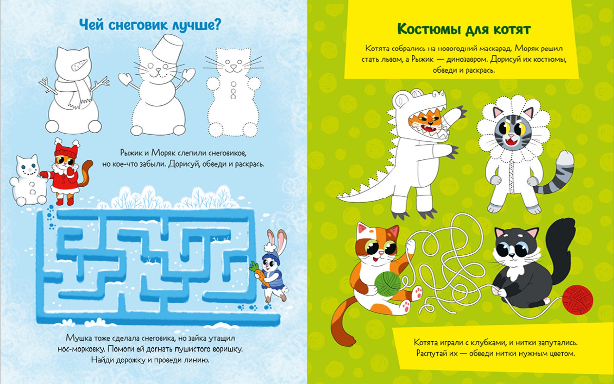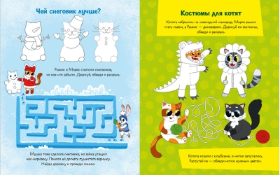 Готовьтесь к Новому году, играйте и развивайтесь с веселыми котятами. Внутри — лабиринты, раскраски, игры «найди и покажи», письмо Деду Морозу и многое другое.