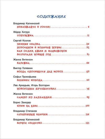 Новогодние сказки российских авторов, известных как замечательные сценаристы - Сергея Козлова, Федора Хитрука, Жанны Витензон, Софьи Прокофьевой, Бориса Заходера и других - создадут настоящее новогоднее настроение и детям, и взрослым. Многие из этих сказок знакомы нам по любимым мультфильмам - «Варежка», «Сампо из Лапландии», «Как Ёжик и Медвежонок встречали Новый год», «Топтыжка», «Новогоднее путешествие» и др. Иллюстрации Любови Ереминой.