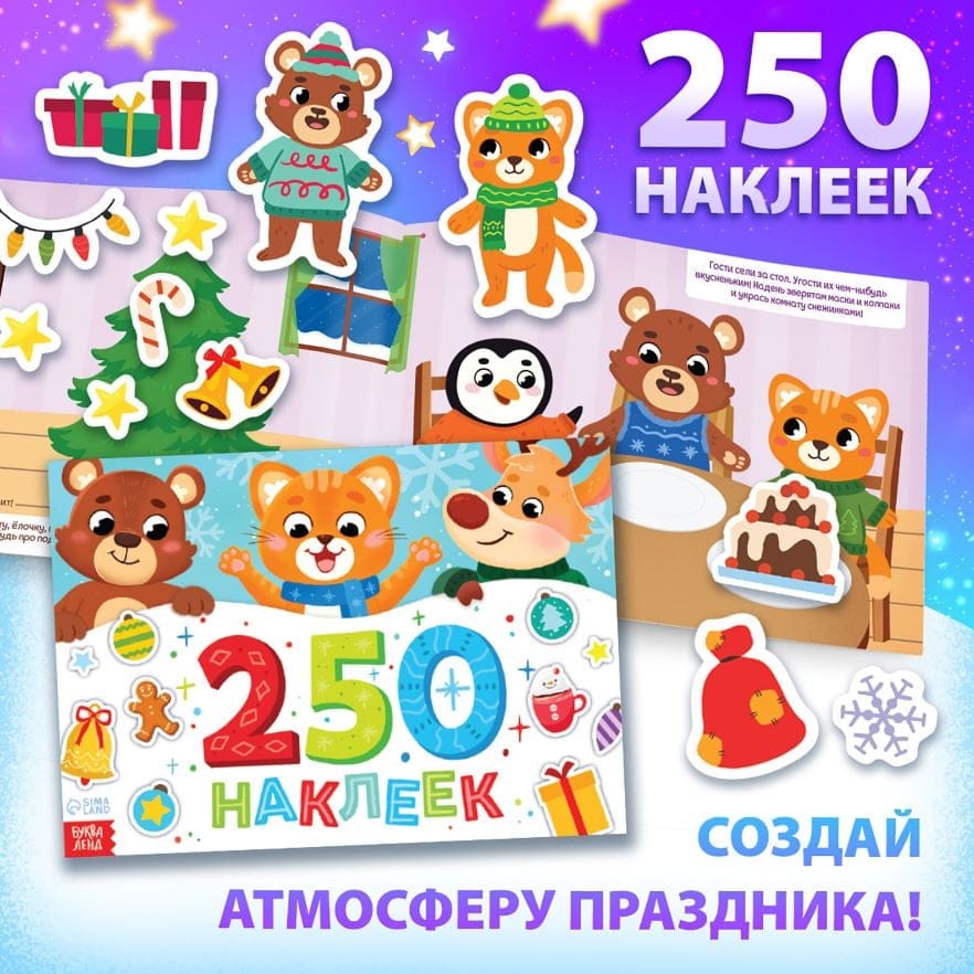 - Альбом с наклейками — В альбоме 250 новогодних наклеек, которые нужно наклеивать на страницы в нужные места, чтобы картинка стала яркой и красивой.