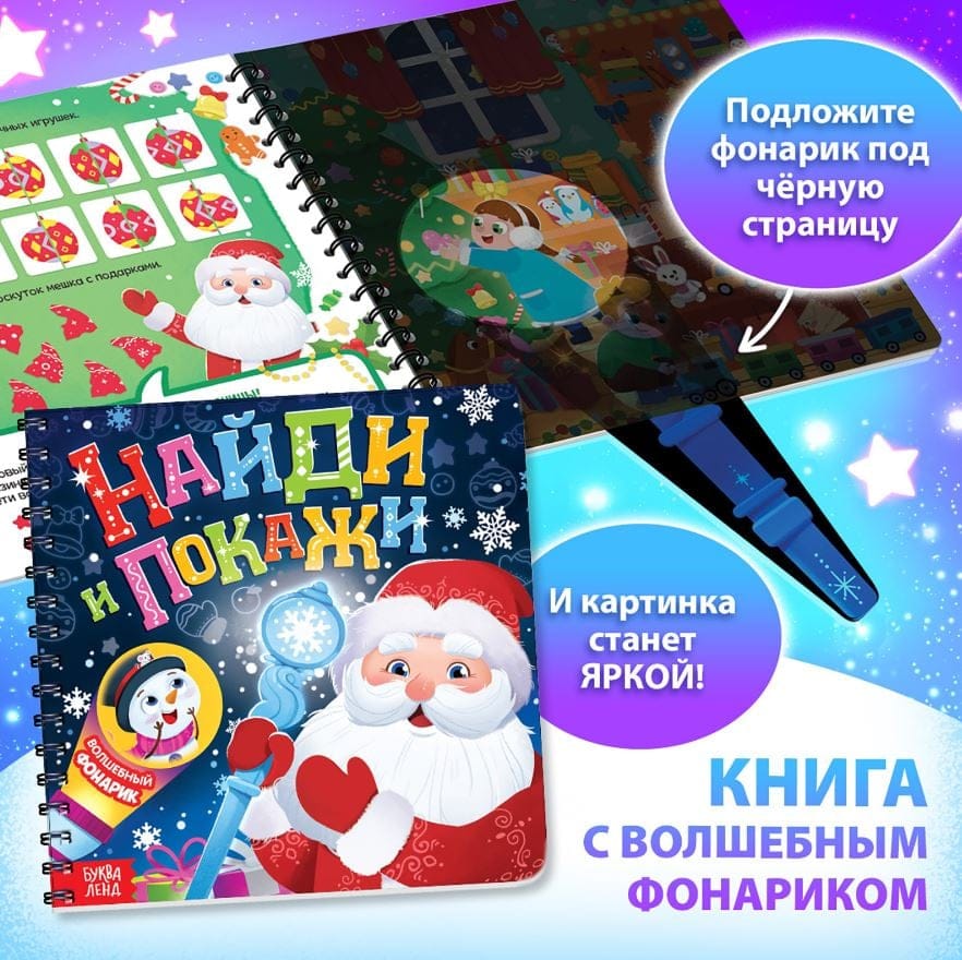 - Книга с фонариком — Ребёнку предстоит светить фонариком на страницы, чтобы новогоднее чудо появилось из темноты.