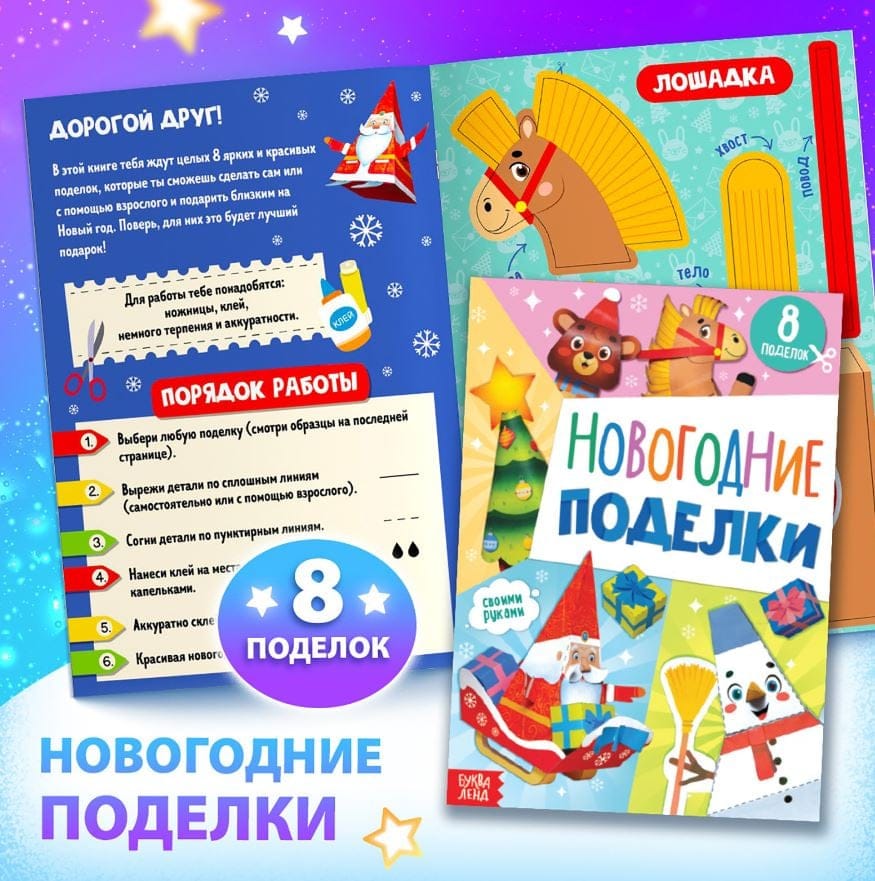 - Новогодние поделки — Вырезай, собирай, склеивай и дари красивые поделки на Новый год! Набор позволит создать 8 новогодних фигурок.