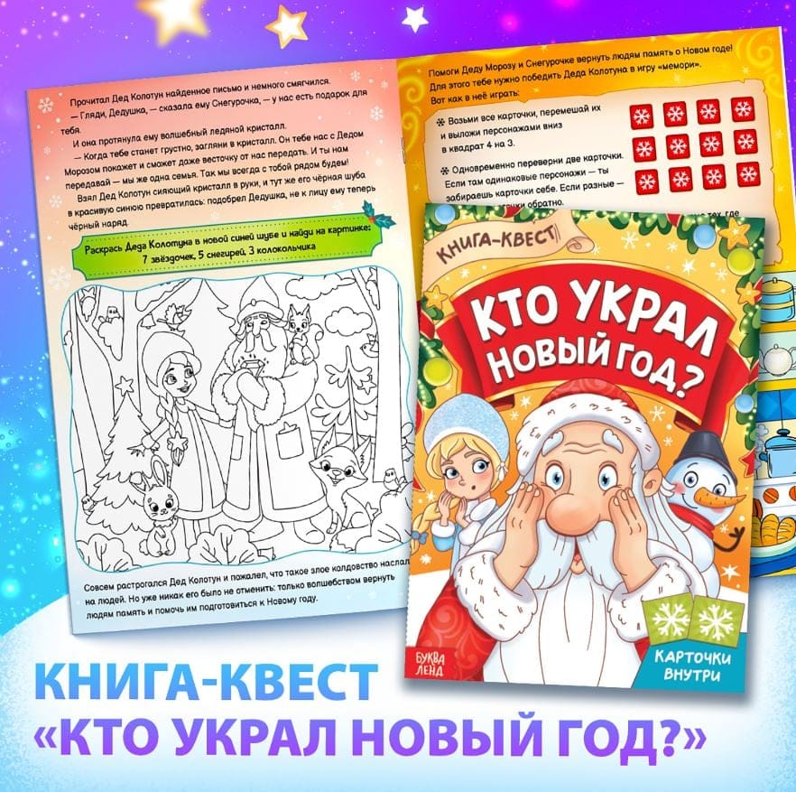 - Книга-квест «Кто украл новый год?» — Решай загадки, проходи лабиринты — спаси праздник!