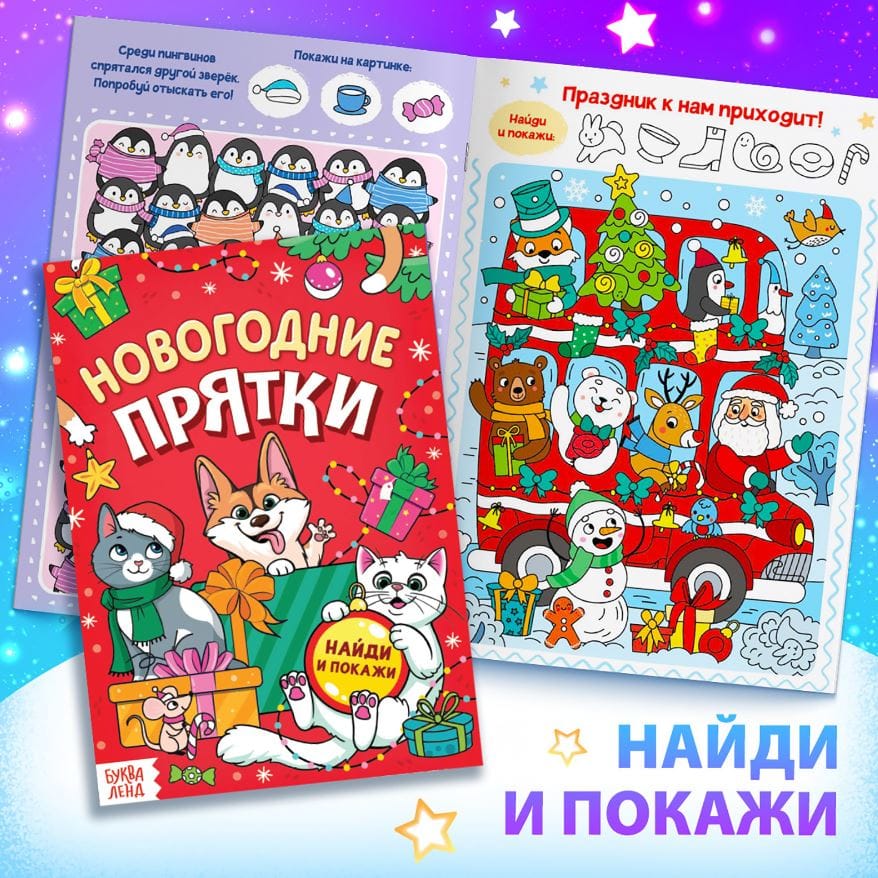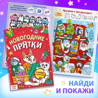 - Новогодние прятки — В этой книге много-много зимних и новогодних находилок для тренировки внимания.
