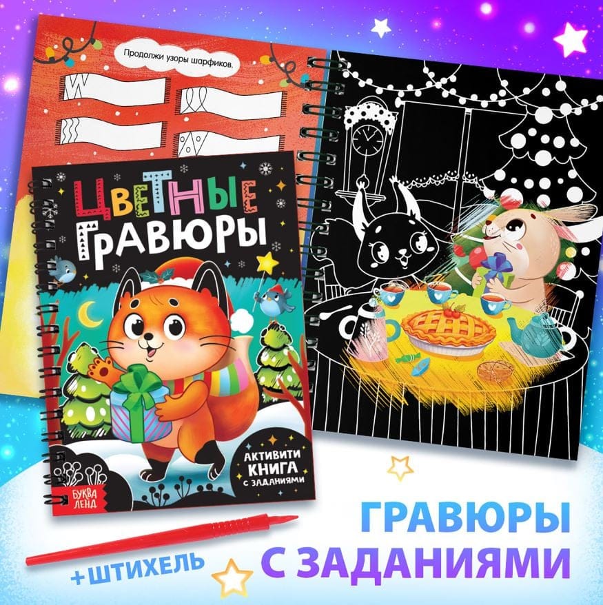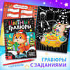 - Цветные гравюры — На чёрных листах нужно процарапать картинку — и она заиграет всеми цветами радуги.