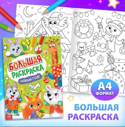 - Большая раскраска — На красочных большущих A4 разворотах раскраски ребёнку будет интересно создавать свои истории.