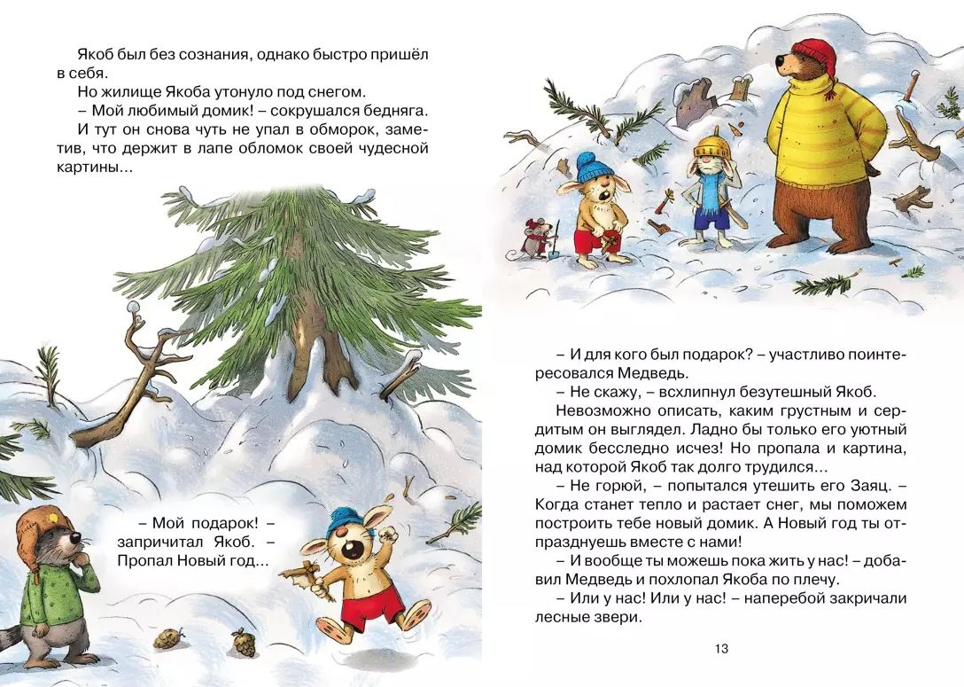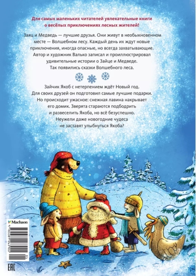 Заяц и Медведь — лучшие друзья. Они живут в необыкновенном месте — Волшебном лесу. Каждый день их ждут новые приключения, иногда опасные, но всегда захватывающие. Автор и художник Валько записал и проиллюстрировал удивительные истории о Зайце и Медведе. Так появились сказки Волшебного леса. Зайчик Якоб с нетерпением ждёт Новый год, любимый праздник всех жителей Волшебного леса. Для своих друзей, Зайца и Медведя, он подготовил самый лучший подарок – их парадный портрет. Но происходит ужасное: снежная лавина накрывает его домик и уничтожает картину. Зверята стараются подбодрить и развеселить Якоба, но всё безуспешно. Неужели даже новогодние чудеса не заставят улыбнуться Якоба?