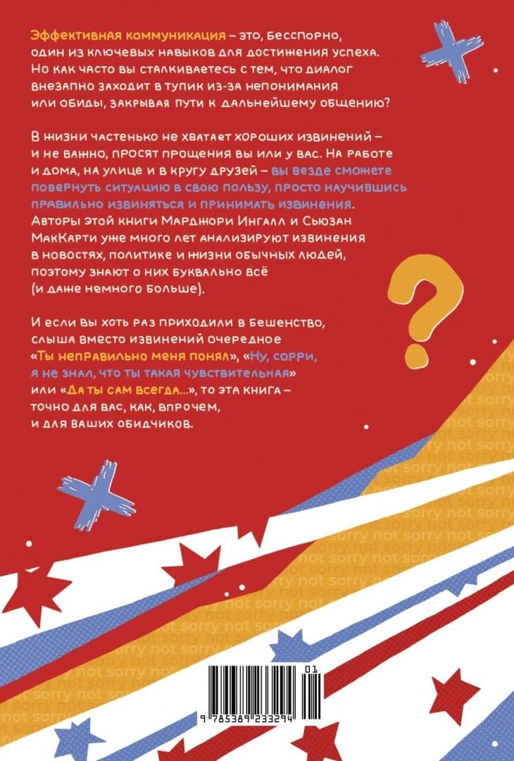Эффективная коммуникация – это, бесспорно, один из ключевых навыков для достижения успеха. Но как часто вы сталкиваетесь с тем, что диалог внезапно заходит в тупик из-за непонимания или обиды, закрывая пути к дальнейшему общению? В жизни частенько не хватает хороших извинений – и не важно, просят прощения вы или у вас. На работе и дома, на улице и в кругу друзей – вы везде сможете повернуть ситуацию в свою пользу, просто научившись правильно извиняться и принимать извинения. Авторы этой книги Марджори Ингалл и Сьюзан МакКарти уже много лет анализируют извинения в новостях, политике и жизни обычных людей, поэтому знают о них буквально всё (и даже немного больше). И если вы хоть раз приходили в бешенство, слыша вместо извинений очередное «Ты неправильно меня понял», «Ну, сорри, я не знал, что ты такая чувствительная» или «Да ты сам всегда...», то эта книга – точно для вас, как, впрочем, и для ваших обидчиков.