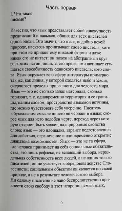 «Нулевая степень письма» (1953) — первая полноценная книга Ролана Барта, выросшая из журнальных статей 1940-х годов и написанная под впечатлением от эссе Жан-Поля Сартра «Что такое литература?». В этом основополагающем для своего дальнейшего творчества тексте Барт проводит различие между языком и стилем и определяет понятие «письмо», рассматривая этапы его эволюции, а также предлагает идею «нейтрального письма» — или «нулевой степени письма», — которое преодолевает литературу как буржуазную форму культуры. Работа стала манифестом эпохи «нового романа» и провозвестила структуралистскую революцию 1960-х. В 1999 году вошла в список ста лучших книг XX века, составленный газетой Le Monde.