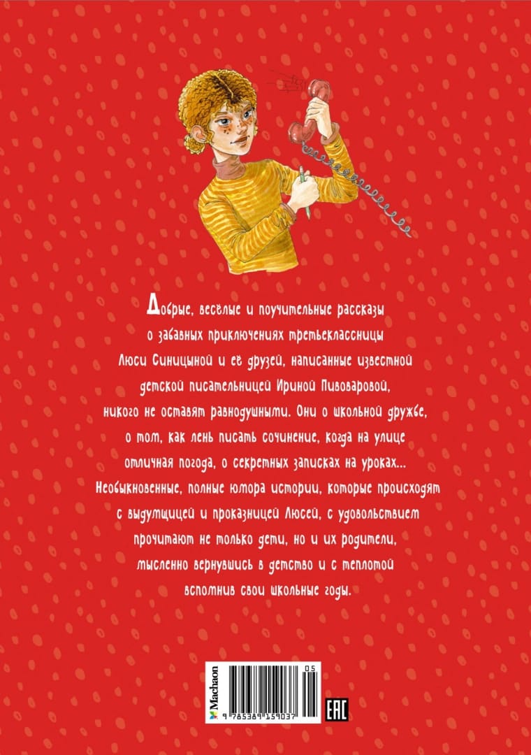 Добрые, весёлые и поучительные рассказы о забавных приключениях третьеклассницы Люси Синицыной и её друзей, написанные известной детской писательницей Ириной Пивоваровой, никого не оставят равнодушными. Они о школьной дружбе, о том, как лень писать сочинение, когда на улице отличная погода, о секретных записках на уроках... Необыкновенные, полные юмора истории, которые происходят с выдумщицей и проказницей Люсей, с удовольствием прочитают не только дети, но и их родители, мысленно вернувшись в детство и с теплотой вспомнив свои школьные годы.