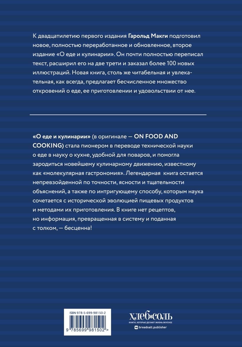 Книга «О еде и кулинарии» стала пионером в том, чтобы подружить научную и кулинарную сторону продуктов и процессов приготовления, и помогла зародиться кулинарному движению, известному как «молекулярная гастрономия». Хотя о кулинарии были написаны другие книги, книга Гарольда Макги остается непревзойденной по точности, ясности и тщательности объяснений, а также по интригующему способу, которым наука сочетается с исторической эволюцией пищевых продуктов и методов приготовления. «О еде и кулинарии» — бесценный и монументальный сборник основной информации об ингредиентах, методах приготовления и удовольствиях от еды. Он порадует и очарует любого, кто когда-либо готовил, смаковал или интересовался едой.