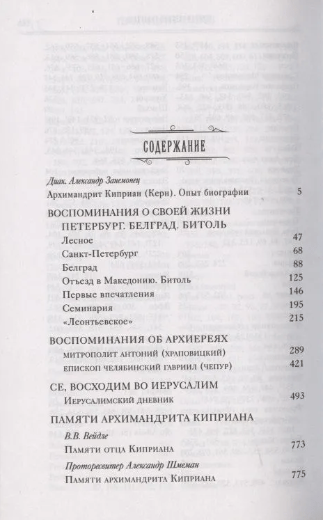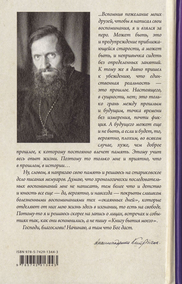 Архимандрит Киприан (Керн; 1899–1960) — одна из ярких и загадочных фигур русского церковного зарубежья. Профессор Сергиевского богословского института, духовный отец многих деятелей русской эмиграции, яркий преподаватель и автор работ по литургике и богословию (среди них — фундаментальное исследование о святителе Григории Паламе), — современникам о. Киприан запомнился прежде всего глубоко православным человеком, монахом по духовному призванию, талантливым и ярко мыслящим исследователем, открытым европейской культуре. Вся взрослая жизнь о. Киприана прошла в в эмиграции: он оказался в Сербии двадцатилетним, стал свидетелем и участником событий, связанных с образованием РПЦЗ, был знаком, дружил и поддерживал отношения со многими представителями русского и европейского церковного мира. Ценность воспоминаний о. Киприана неоспорима. Пока не известно, в каком именно объеме они существуют: русскому читателю могут быть знакомы его записки об архиереях — Антонии (Храповицком) и Гаврииле (Чепуре) — они издавались в 2002 г. В 2013 г. в Иерусалиме вышел его «Иерусалимский дневник». Воспоминания о детстве, начале жизни в Сербии, преподавании в семинарии в Бито-ле, о коллегах и друзьях тех лет были найдены недавно, публикуются впервые и представляют несомненную историческую ценность.
