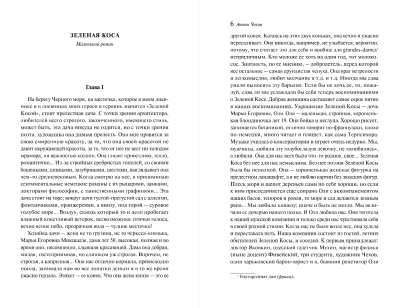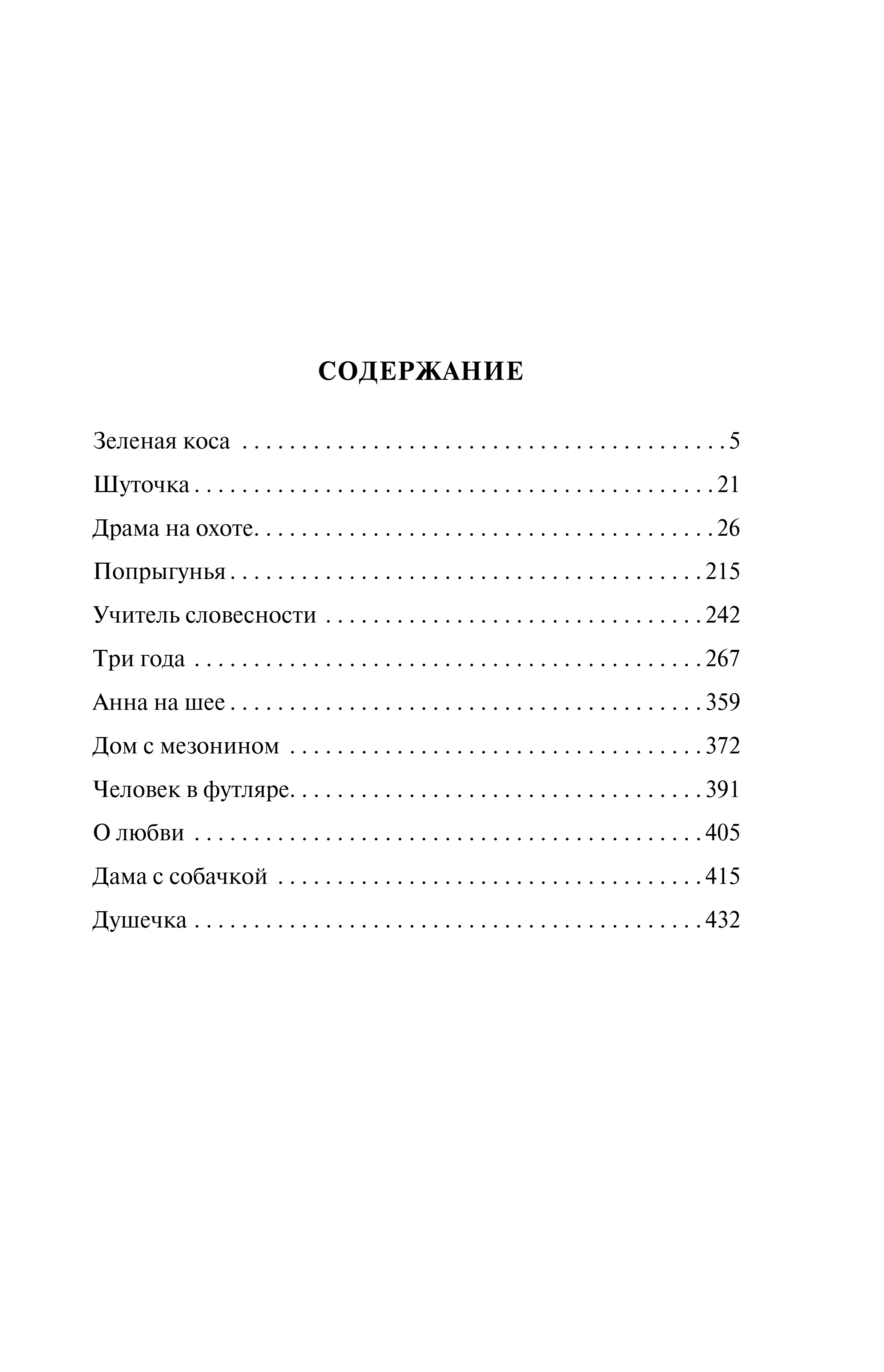 В этой книге собраны его повести и рассказы на эту тему: «Зеленая коса», «Шуточка», «Драма на охоте», «Попрыгунья», «Учитель словесности», «Три года», «Анна на шее», «Дом с мезонином», «Человек в футляре», «О любви», «Дама с собачкой» и «Душечка».