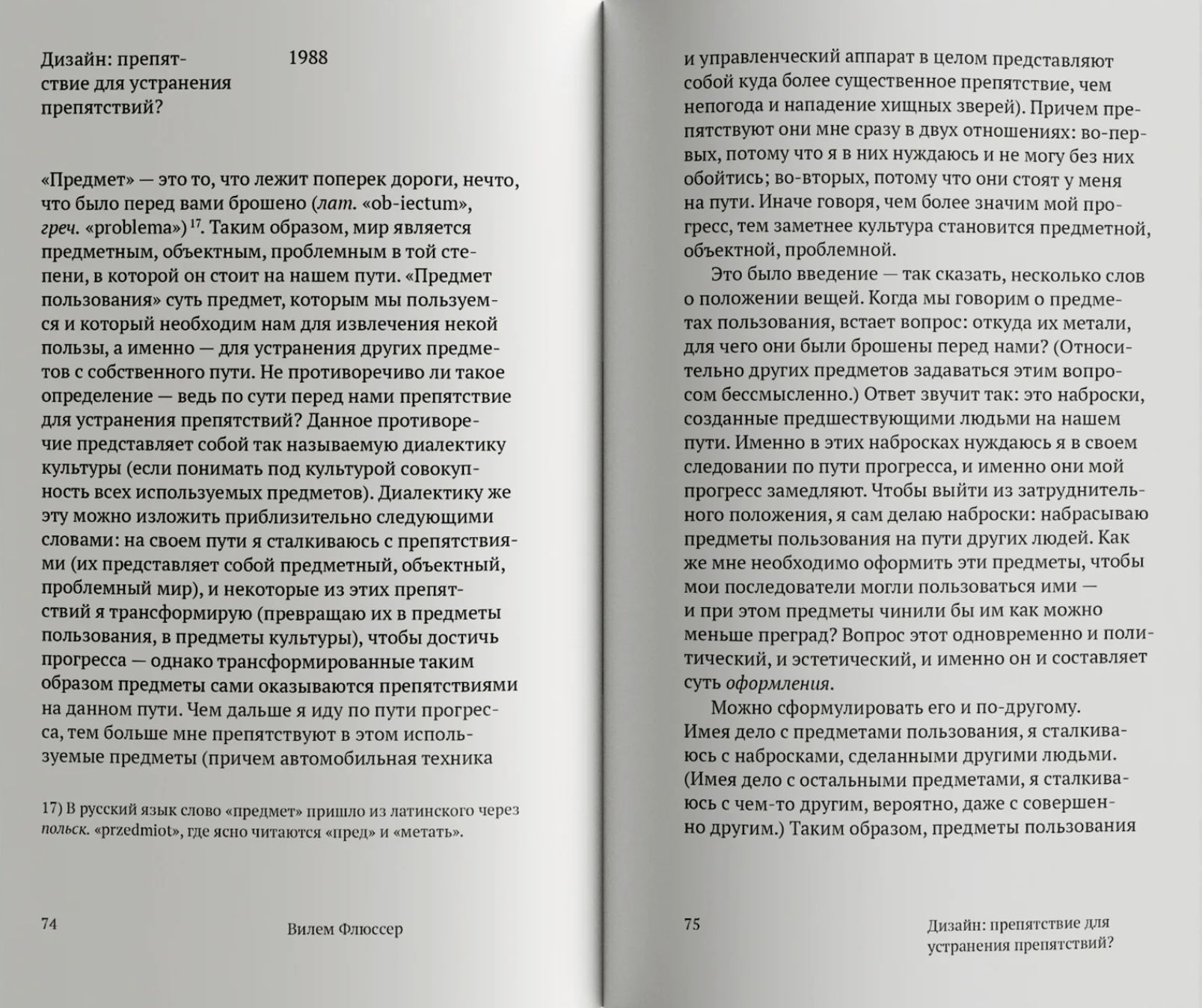 Вилем Флюссер (1920–1991), младший современник Вальтера Беньямина, один из пионеров медиаисследований, создал необычный интеллектуальный жанр. В форме краткой и изящной философской эссеистики он раскрывает смысловые структуры нашего повседневного мира, его важнейших областей и происходящих с ними трансформаций. Анализ Флюссера разворачивается как феноменология окружающих нас заурядных вещей и механизмов, дизайна и городской планировки. При этом, встречая наступление новой цифровой эпохи, он обнаруживает, как чистая цифровая форма всё больше угрожает оставить в прошлом вещественность нашего мира. В парадоксальном стиле мышления Флюссера соединяется пережитый им опыт политических катастроф XX века, проницательный исторический взгляд в прошлое и понимание рисков новой цивилизации для будущего человеческой свободы.