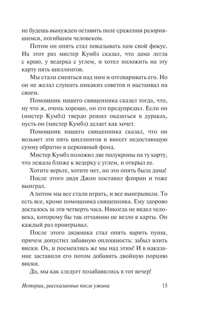 Вы услышите истории о несчастном призраке покойного Джонсона, что часами рыдает и завывает, мешая спать и играть в карты; о духе старого скряги мельника, что, наконец, решил рассказать, куда спрятал клад; и о загадочном привидении, что якобы обитает в голубой комнате. А еще — рассказы о большом черном коте, чье появление меняет жизни встретившихся ему людей; об обычном жителе Лондона, который лег спать и проснулся через тысячу лет; и о штатном авторе популярного журнала, решившем впасть в уныние ради написания трогательной статьи к Рождеству…