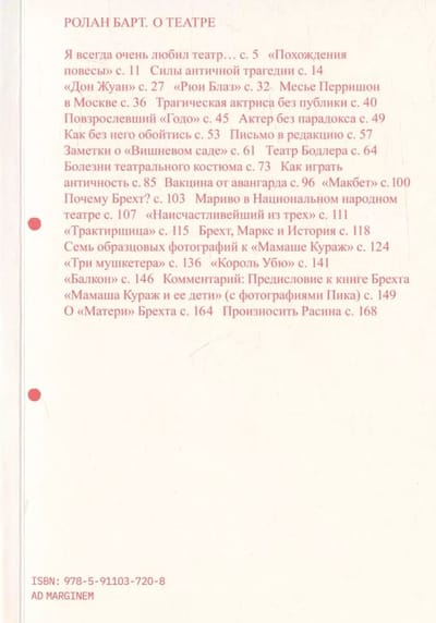 Ролан Барт мало известен нашему читателю как театральный критик. А между тем он был глубоко увлечен театром, и не только как зритель, но и как один из основателей и постоянных авторов журнала Théâtre populaire. Пятидесятые годы — время для французского театра исключительно важное, именно тогда намечаются те линии, которые составляют актуальный театральный пейзаж. Собранные здесь тексты, идет ли речь о критическом отзыве на давно позабытый спектакль, о политическом его звучании, теоретическом аспекте или экскурсе в историю, неизменно касаются самой сущности театра, а потому не теряют интереса и сегодня.