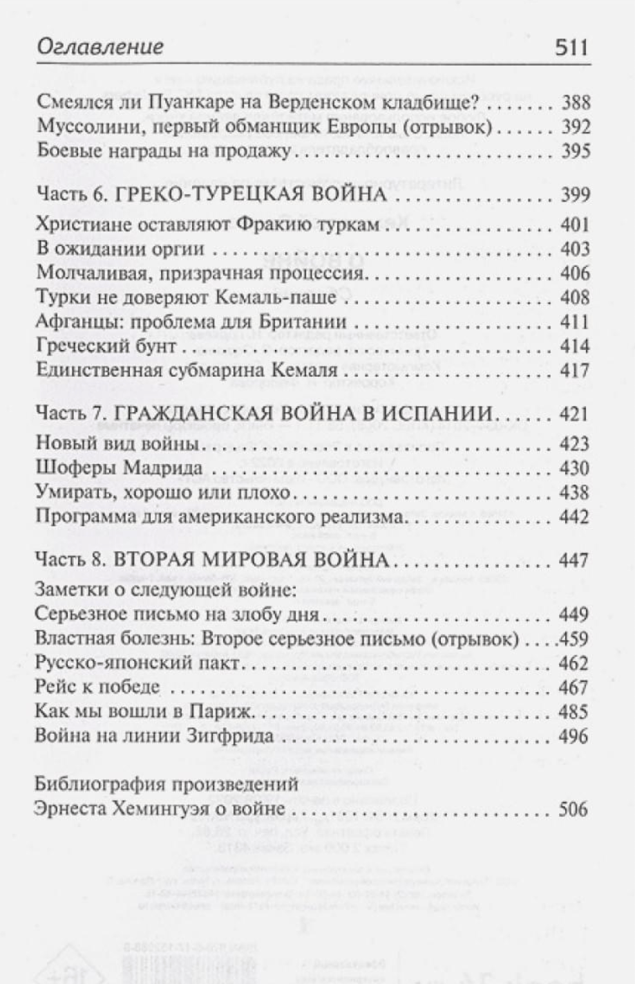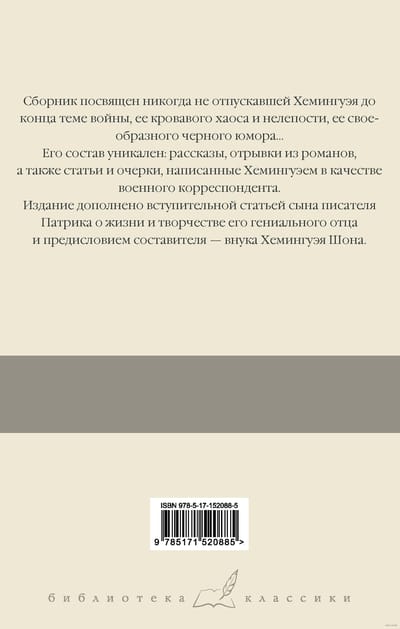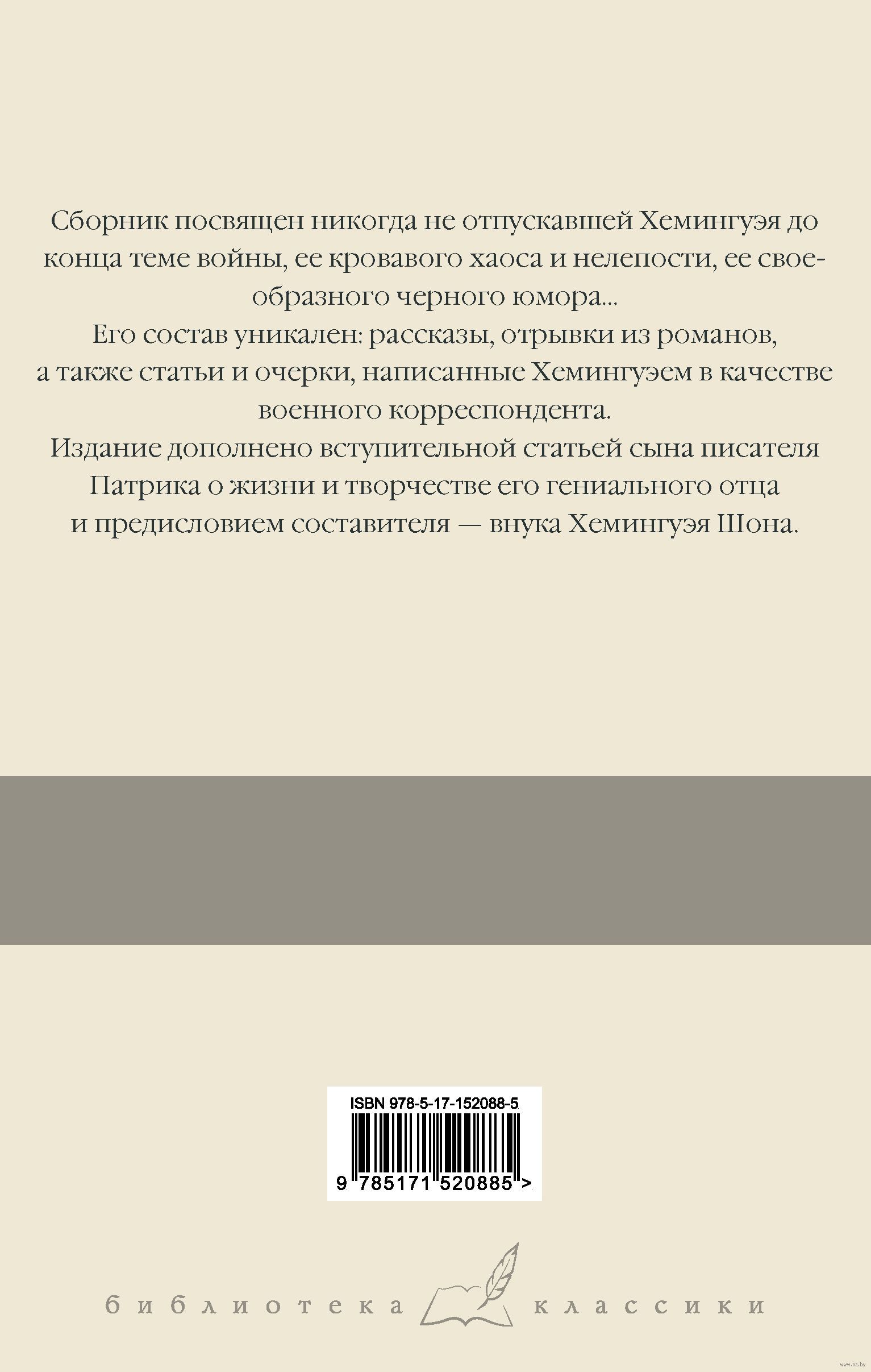 Сборник посвящен никогда не отпускавшей Хемингуэя до конца теме войны, ее кровавого хаоса и нелепости, ее своеобразного черного юмора… Его состав уникален: рассказы, отрывки из романов, а также статьи и очерки, написанные Хемингуэем в качестве военного корреспондента. Издание дополнено вступительной статьей сына писателя Патрика о жизни и творчестве его гениального отца и предисловием составителя — внука Хемингуэя Шона.