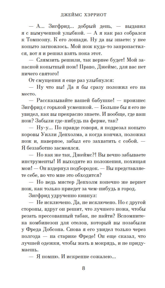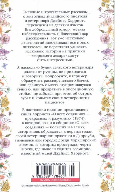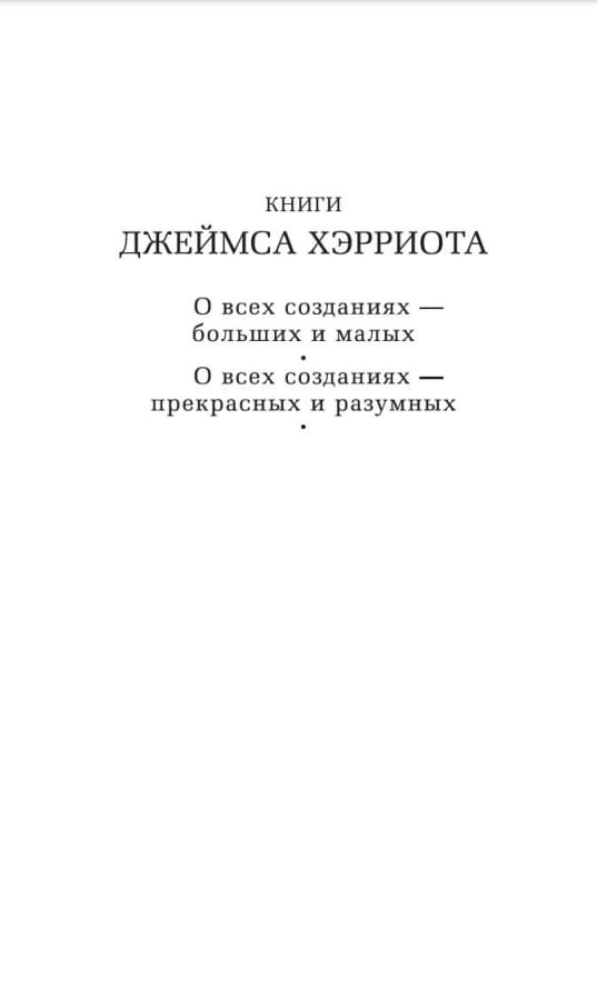 Смешные и трогательные рассказы о животных английского писателя и ветеринара Джеймса Хэрриота переведены на десятки языков. Его добродушный юмор, меткая наблюдательность и блестящий дар рассказчика вот уже несколько десятилетий завоевывают все новых читателей, не переставая удивлять, насколько истории из практики «коровьего лекаря» могут быть интересными. А насколько будни сельского ветеринара далеки от рутины, не приходится и говорить! Попробуйте, например, образумить рассвирепевшего бычка, или сдвинуть с места заупрямившуюся свинью, или превратить в операционную стойло, не забывая при этом об острых зубах и копытах своих четвероногих пациентов. В настоящем издании представлена книга Хэрриота «О всех созданиях – прекрасных и разумных» (1974), в которой, как и в сборнике «О всех созданиях – больших и малых», автор вновь обращается к первым годам своей ветеринарной практики в Дарроуби, вымышленном городке среди йоркширских холмов, за которым проступают черты Тирска, где ныне находится всемирно известный музей Джеймса Хэрриота.