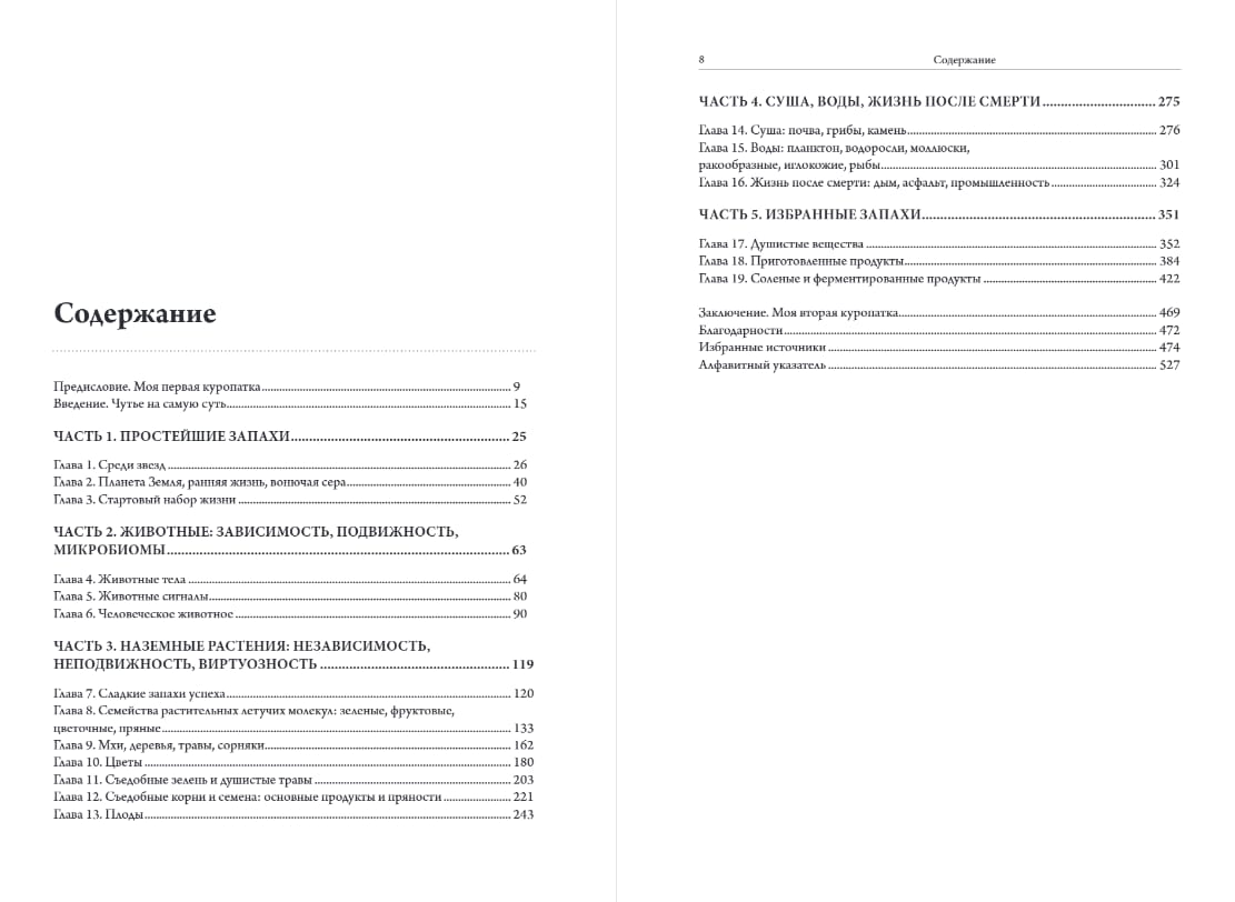 Макги знакомит нас с реальными частицами материи, которые мы вдыхаем, — с молекулами, которые запускают наше восприятие, вызывают цитрусовые запахи кориандра и пива, а также лечебные запахи нарциссов и морских ежей. Начиная с происхождения этих молекул в межзвездном пространстве, Макги продвигается вперед через запахи нашей планеты, воздуха и океанов, леса, лугов и города, вплоть до запахов благовоний, духов, вина и еды.