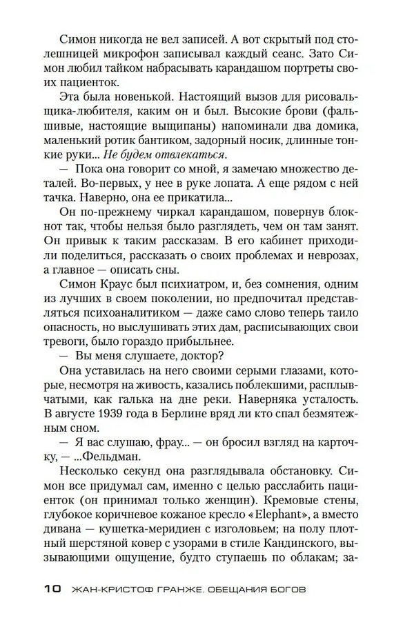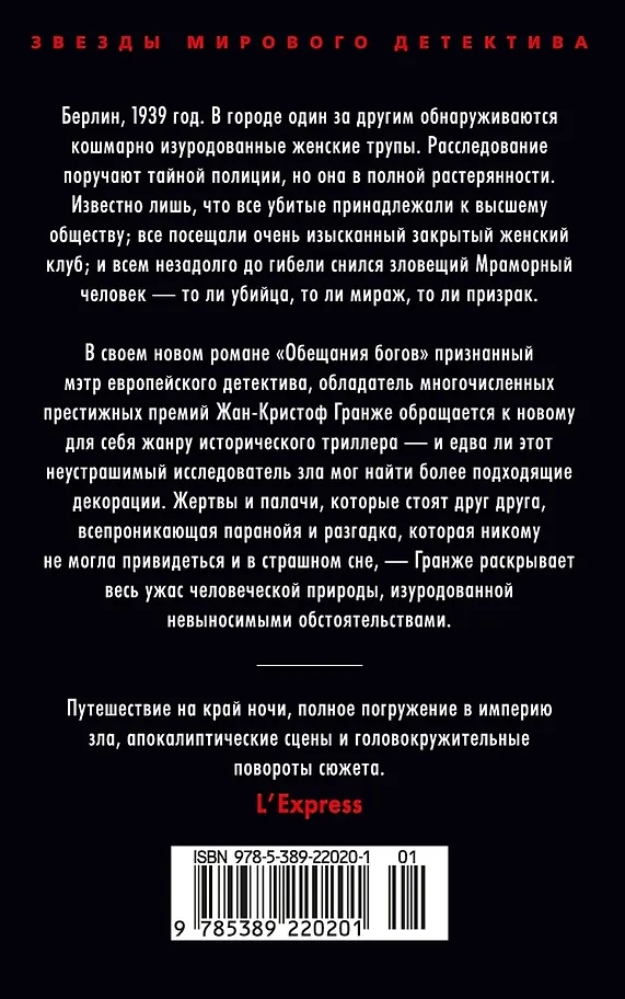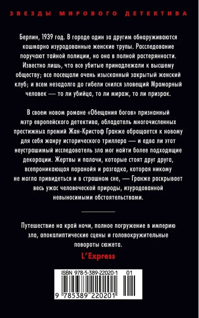 Берлин, 1939 год. В городе один за другим обнаруживаются кошмарно изуродованные женские трупы. Расследование поручают тайной полиции, но она в полной растерянности. Известно лишь, что все убитые принадлежали к высшему обществу; все посещали очень изысканный закрытый женский клуб; и всем незадолго до гибели снился зловещий Мраморный человек — то ли убийца, то ли мираж, то ли призрак. Серийные убийства надо раскрыть любой ценой, неудача чревата наказанием вплоть до расстрела, и от безнадежности следователь Франц Бивен, который не умеет раскрывать реальные преступления, зато умеет выбивать признания из невинных людей, объединяет усилия с двумя гражданскими психиатрами. Поиски убийцы поведут этих троих крайне извилистой тропой: вместе с ними читатель не раз упрется в тупик и в итоге отыщет правду в очень страшных краях. В своем романе «Обещания богов» признанный мэтр европейского детектива, обладатель многочисленных престижных премий Жан-Кристоф Гранже обращается к новому для себя жанру исторического триллера — и едва ли этот неустрашимый исследователь зла мог найти более подходящие декорации. Жертвы и палачи, которые стоят друг друга, всепроникающая паранойя и разгадка, которая никому не могла привидеться и в страшном сне, — Гранже раскрывает весь ужас человеческой природы, изуродованной невыносимыми обстоятельствами.