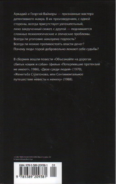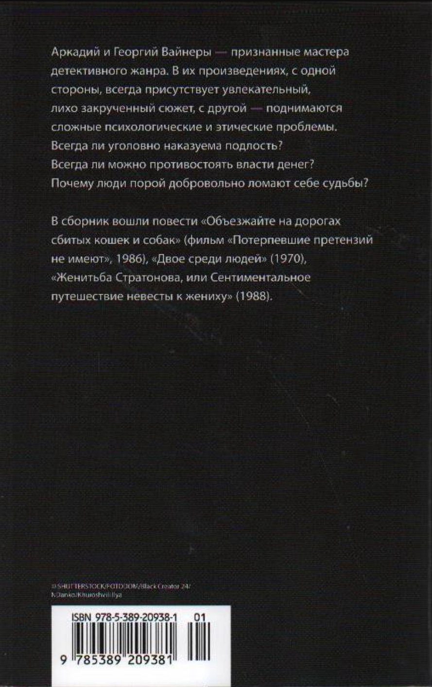 Всегда ли уголовно наказуема подлость? Всегда ли можно противостоять власти денег? Почему люди порой добровольно ломают себе судьбы? В сборник вошли повести «Объезжайте на дорогах сбитых кошек и собак» (фильм «Потерпевшие претензий не имеют», 1986), «Двое среди людей» (1970), «Женитьба Стратонова, или Сентиментальное путешествие невесты к жениху» (1986).