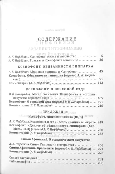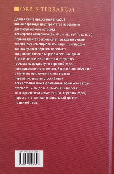 Данная книга представляет собой новые переводы двух трактатов известного древнегреческого историка Ксенофонта Афинского (ок. 445 — ок. 354 гг. до н. э.). Первый трактат рекомендует гражданину Афин, избранному командиром конницы — гиппархом, как наилучшим образом исполнять свои обязанности в мирное и военное время. Второе сочинение является инструкцией греческому всаднику по верховой езде, преимущественно нацеленной на военное обучение.