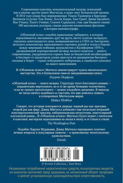 Современная классика, монументальный шедевр, вошедший, как и многие другие книги Митчелла, в шорт-лист Букеровской премии. В 2012 году роман был экранизирован Томом Тыквером и братьями Вачовски (в ролях Том Хэнкс, Хэлли Берри, Хью Грант, Джим Бродбент, Бен Уишоу, Хьюго Уивинг, Сьюзен Сарандон), став, при бюджете свыше 100 миллионов долларов, самым дорогим независимым фильмом в истории кинематографа.