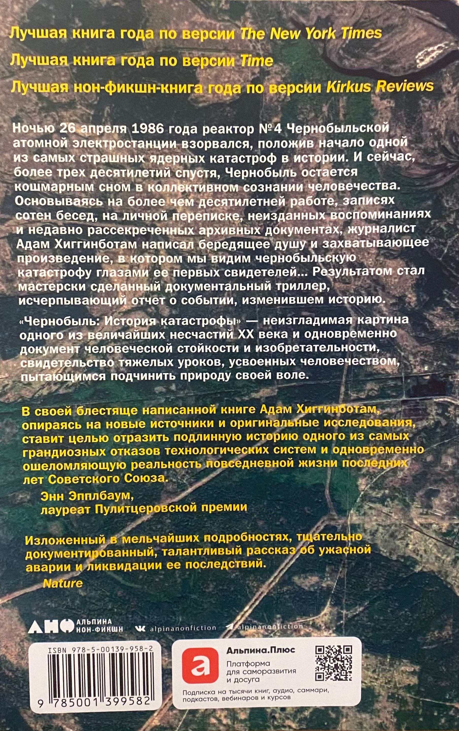 Основываясь на более чем десятилетней работе, записях сотен бесед, на личной переписке, неизданных воспоминаниях и недавно рассекреченных архивных документах, журналист Адам Хиггинботам написал бередящее душу и захватывающее произведение, в котором мы видим чернобыльскую катастрофу глазами ее первых свидетелей.