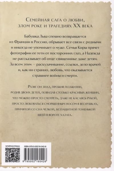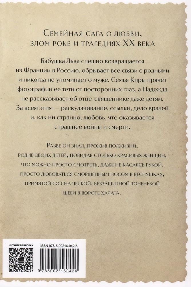 Бабушка Льва спешно возвращается из Франции в Россию, обрывает все связи с родными и никогда не упоминает о муже. Семья Киры прячет фотографии ее тети от посторонних глаз, а Надежда не рассказывает об отце-священнике даже детям. За всем этим — раскулачивание, ссылки, дело врачей и, как ни странно, любовь, которая оказывается страшнее войны и смерти. Роман становится больше чем семейной сагой, поскольку охватывает историю сразу нескольких семей, объединенных узами брака, изменами и трагедиями XX века.