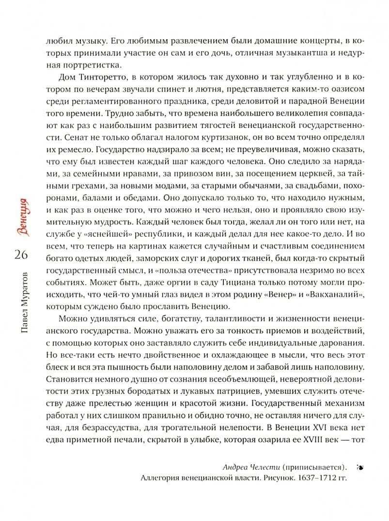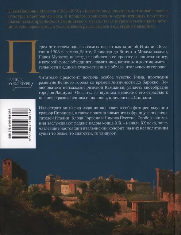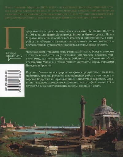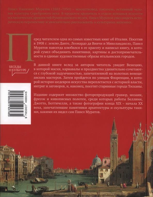 Павел Павлович Муратов (1881-1950) - искусствовед, писатель, истинный человек культуры Серебряного века. В прошлом хранитель в отделе изящных искусств и классических древностей Румянцевского музея, Павел Муратов умел видеть историческую перспективу и увлекательно рассказывать о культурных явлениях. Перед читателем одна из самых известных книг об Италии. Посетив в 1908 г. землю Данте, Леонардо да Винчи и Микеланджело, Павел Муратов навсегда влюбился в ее красоту и написал книгу, в которой сумел объединить памятники, картины и достопримечательности в единые художественные образы итальянских городов. В данной книге вслед за автором читатель увидит Венецию, в которой маски, карнавалы и празднества удивительно сочетаются с глубокой задумчивостью, запечатленной на полотнах венецианских мастеров. Затем пройдется по улицам Флоренции, в которой история шедевров искусства переплетается с историей власти, интриг и заговоров, и, наконец, посетит старинные города Тосканы. Издание содержит множество фоторепродукций гравюр, мозаик, фресок и живописных полотен, среди которых работы Беллини, Джотто, Боттичелли, а также фотографии конца XIX - начала XX века, запечатлевшие памятники архитектуры и скульптуры такими, какими их видел сам Павел Муратов.