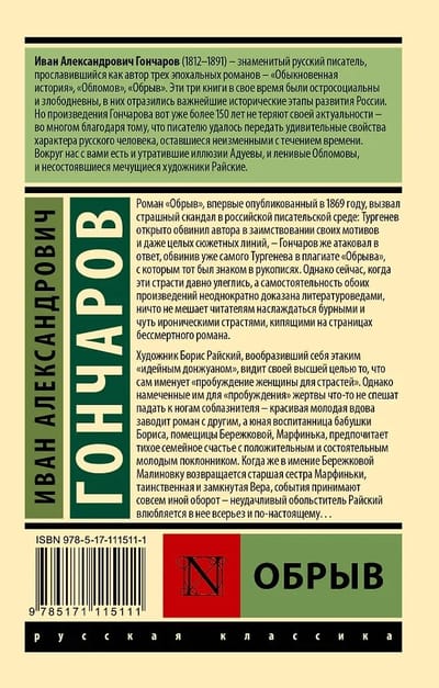 Роман «Обрыв», впервые опубликованный в 1869 году, вызвал страшный скандал в российской писательской среде: Тургенев открыто обвинил автора в заимствовании своих мотивов и даже целых сюжетных линий, — Гончаров же атаковал в ответ, обвинив уже самого Тургенева в плагиате «Обрыва», с которым тот был знаком в рукописях. Однако сейчас, когда эти страсти давно улеглись, а самостоятельность обоих произведений неоднократно доказана литературоведами, ничто не мешает читателям наслаждаться бурными и чуть ироническими страстями, кипящими на страницах бессмертного романа.