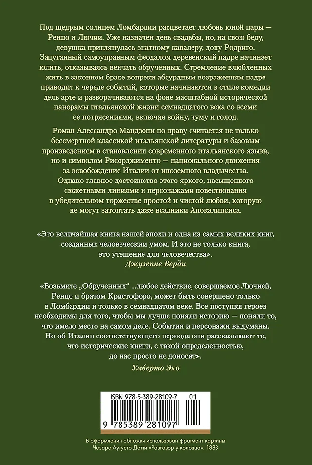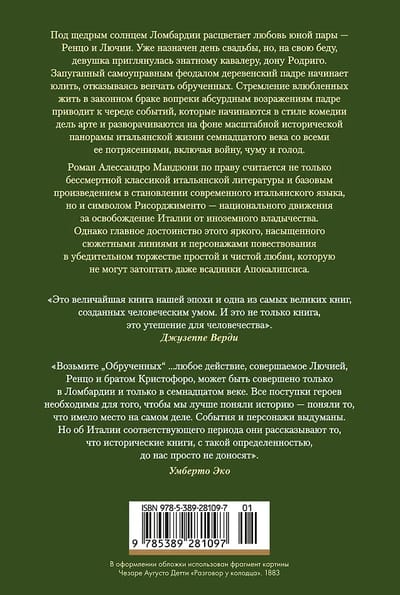 Роман Алессандро Мандзони по праву считается не только бессмертной классикой итальянской литературы и базовым произведением в становлении современного итальянского языка, но и символом Рисорджименто — национального движения за освобождение Италии от иноземного владычества. Однако главное достоинство этого яркого, насыщенного сюжетными линиями и персонажами повествования в убедительном торжестве простой и чистой любви, которую не могут затоптать даже всадники Апокалипсиса.