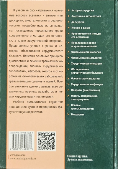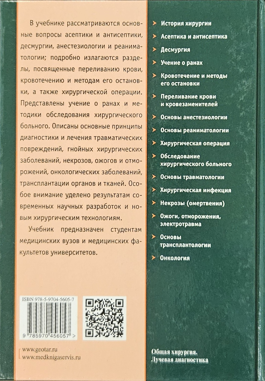 В учебнике рассмотрены основные вопросы асептики и антисептики, десмургии, анестезиологии и реаниматологии; подробно изложены разделы, посвященные переливанию крови, кровотечению и методам его остановки, а также хирургической операции. Представлены учение о ранах и методики обследования хирургического больного. Описаны основные принципы диагностики и лечения травматических повреждений, гнойных хирургических заболеваний, некрозов, ожогов и отморожений, онкологических заболеваний, трансплантации органов и тканей. Особое внимание уделено результатам современных научных разработок и новым хирургическим технологиям.