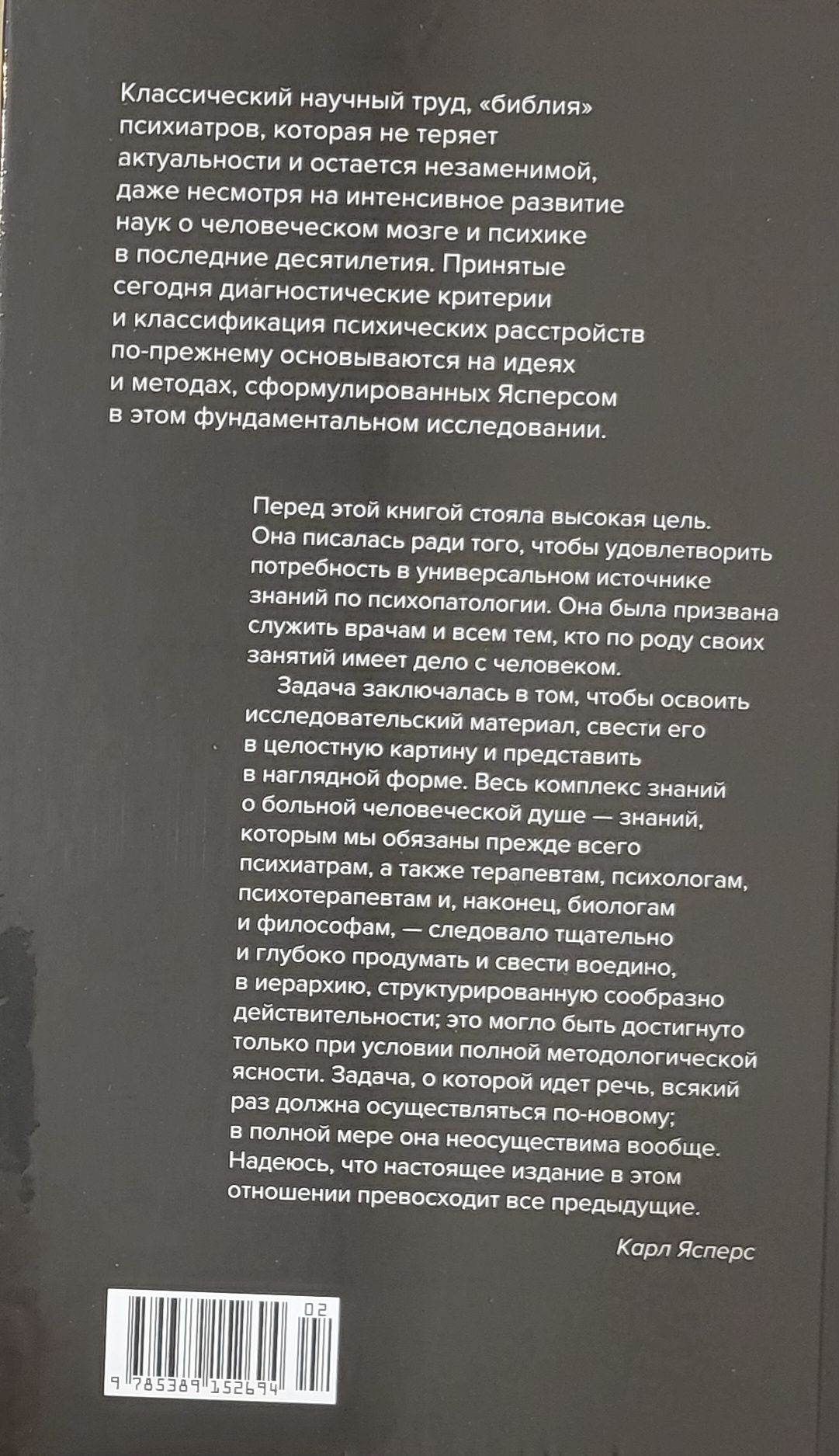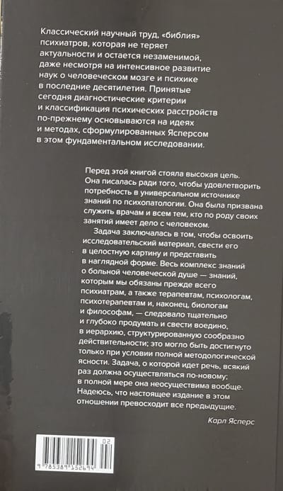 Карл Ясперс (1883–1969) прославился в первую очередь как философ, один из основоположников экзистенциализма, чье влияние отмечали Альбер Камю, Жан-Поль Сартр, Ханна Арендт. Однако Ясперс был не только философом, но и врачом-психиатром, и выросшая из его докторской диссертации "Общая психопатология" — результат нескольких лет работы в психиатрической больнице. Ясперс был глубоко не удовлетворен существовавшими в его время подходами к изучению и лечению душевных болезней, он считал, что эта отрасль медицины находится в глубоком кризисе, и поставил себе амбициозную задачу разработать новые научные основания для психиатрии. Фактически он создал философию психиатрии, разработал новый язык и категориальный аппарат для описания и классификации психических расстройств. Первое издание "Общей психопатологии" вышло в 1913 году, когда Ясперсу было 30 лет; книга стала делом его жизни, при каждом переиздании он перерабатывал и расширял ее — вплоть до 1959 года, когда вышло 7-е издание. Это классика психиатрической литературы, настольная книга психиатров, которая, даже несмотря на интенсивное развитие наук о человеческом мозге и психике в последние десятилетия, остается незаменимой. Принятые сегодня диагностические критерии, как и классификация психических расстройств, по-прежнему основываются на идеях и методах, изложенных в этой работе.
