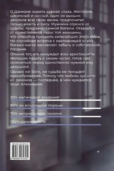 О Дамиане ходила дурная слава. Жестокий, циничный и наглый, один из высших демонов всю свою жизнь предпочитал только власть и силу. Мужчина отрекся от судьбы, предначертанной Богами. Отказался от единственной пары: той женщины, что способна покорить сильнейших этого мира. Но случайная встреча с наследницей клана боевых магов заставляет забыть о собственной гордыне. Отныне тот, кто вынуждал всех аристократок Империи падать к своим ногам, готов сам склониться перед единственно нужной ему девушкой. Однако ни Боги, ни судьба не прощают пренебрежения. Потому что любовь худшего из демонов — последнее, в чем нуждается леди Алеминрия...